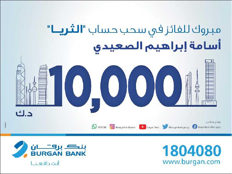أعلن بنك برقان فوز أسامة إبراهيم الصعيدي في سحب حساب الثريا للراتب الشهري، الذي فاز بجائزة بقيمة 10.000 دينار.وأوضح البنك أنه يمكن فتح حساب الثريا للراتب بالدينار الكويتي، أو غيره من العم ات، وأنه يمنح لصاحبه العديد من المميزات، منها الحصول على قرض أو بطاقة ائتمانية تناسب احتياجاته، إضافة إلى الاستفادة من العروض والخصومات على مدار العام.