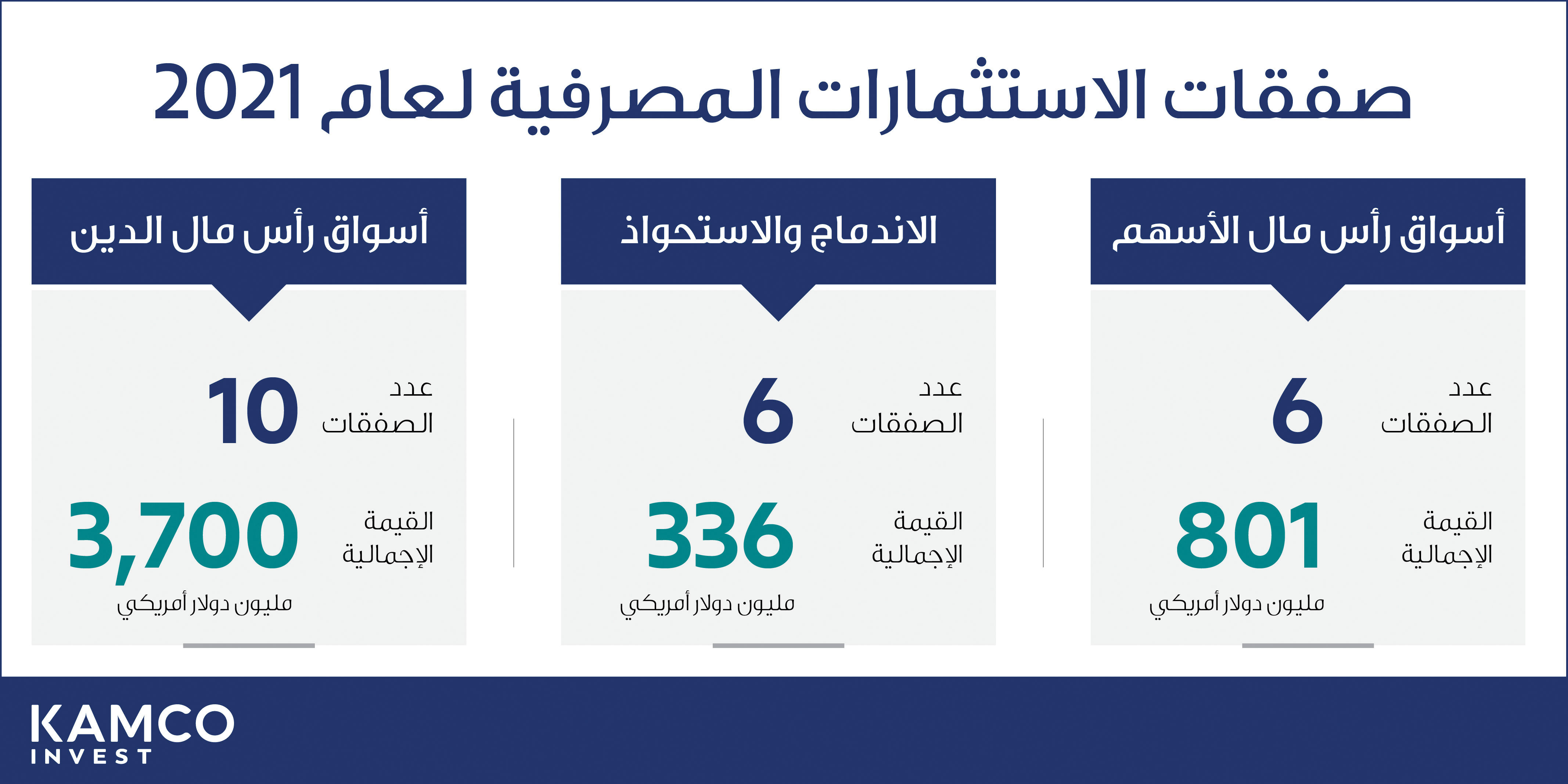 «كامكو إنفست»: «الاستثمارات المصرفية» نفذ 22 صفقة بـ 4.8 مليارات دولار خلال 2021