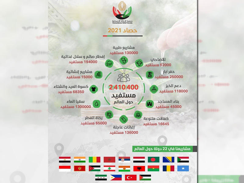 أعلنت جمعية الإغاثة الإنسانية، في تقريرها السنوي لعام 2021، أن عدد المستفيدين من مشاريع الجمعية خلال العام الماضي تجاوز 2.5 مليون مستفيد.وأوضح رئيس مجلس الإدارة د. سلطان الخنة، أنه ضمن تلك المشاريع داخليا: إفطار الصائم، وكفالة الأسر المتعففة، ومساعدة الطلبة دراسياً، ومشروع الأضاحي، والسلال الغذائية، وسقيا الماء، ودعم ذوي الاحتياجات الخاصة، وتوزيع الوجبات الغذائية للعمال، والمساهمة في الخدمات المجتمعية بالمساجد والمرافق العامة.