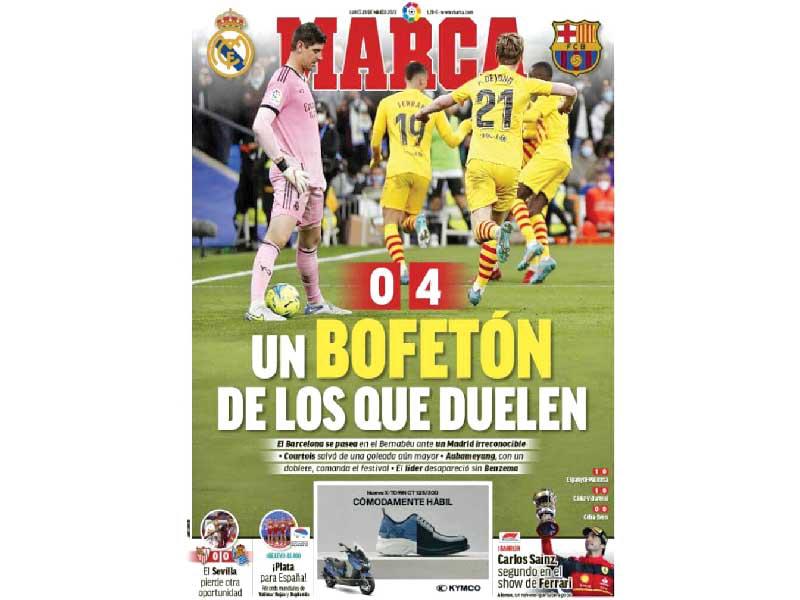 من جانبها، أبرزت «ماركا» في افتتاحيتها أن الميرينغي تعرض لـ«واحدة من تلك الضربات المؤلمة»، مشيرة إلى أن «برشلونة هيمن على البيرنابيو أمام ريال مدريد الذي لم يكن على طبيعته».كما أشارت الصحيفة المدريدية إلى أن الريال متصدر الليغا «اختفى بدون بنزيمة» في إشارة لغياب المهاجم الفرنسي بسبب الإصابة.أما صحيفة «سبورت»، فافتتحت عددها اليوم بصورة للاعبي برشلونة وهم يحتفلون على أرض الريال، وعنونتها «سعدءا بالعودة لهزيمتكم مرة أخرى».واحتفت الصحيفة الكتالونية بأن البرشا «أهان الريال على ملعبه»، مبرزة «الانتصار الكبير لفريق تشافي».بدورها، سلطت صحيفة «موندو ديبورتيفو» الكتالونية أيضا، الضوء على عودة برشلونة، مشيرة إلى أن «البرشا عاد: الاستعراض الذي قدمه في البيرنابيو مكتسحا الريال يثبت ذلك».