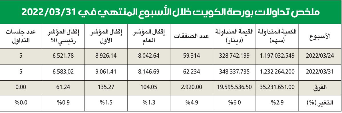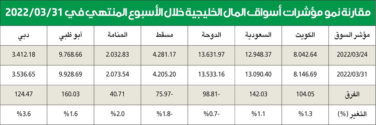 حقق مؤشرا سوقي الإمارات دبي المالي وأبوظبي مكاسب جيدة بنهاية تعاملات الأسبوع الأخير من شهر مارس، وهو الأخير في الربع الأول وقبل بداية تعاملاتهما الرمضانية، وانتهى مؤشر دبي إلى تصدر الرابحين خليجياً بنمو بلغ نسبة 3.6 في المئة أي ما يعادل 124.47 نقطة ليقفل على مستوى 3536.65 نقطة مخترقاً مستوى مئوياً جديداً وهو 3500 نقطة للمرة الأولى منذ بداية عام 2018 أي قبل أكثر من أربع سنوات ليصل بمكاسب الربع الأول من هذا العام إلى 10 في المئة.ودفعت نتائج الأعمال واستقرار أسعار النفط وحالة التفاؤل بما يخص الحرب الأوكرانية - الروسية المؤشر إلى الإيجابية، وكانت 56 شركة أعلنت نتائجها السنوية لعام 2021 ولم يتبق سوى شركتين فقط لم تعلنا وبنمو إجمالي بلغ 196 في المئة قياساً بأداء عام 2020 وارتفعت أرباح 38 شركة بينما تراجعت نتائج 18 منها 8 سجلت خسارة.وسجل مؤشر سوق أبوظبي إقفالاً قياسياً جديداً مقترباً من حاجز 10 آلاف نقطة وللمرة الأولى في تاريخه، إذ بلغ مستوى 9928.69 نقطة بنمو بنسبة 1.6 في المئة هي 160.03 نقطة خلال الأسبوع الماضي لتبلغ مكاسبه للربع الأول من هذا العام نسبة 16 في المئة.وأعلنت جميع شركات مؤشر أبوظبي المدرجة نتائجها وهي 78 شركة حيث نمت أرباح 65 شركة وتراجعت أرباح 13 شركة وسجلت نمواً إجمالياً بنسبة 73 في المئة مقارنة مع أداء عام 2020.بورصة الكويت