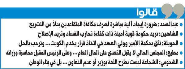 من جانبه، أعرب النائب محمد الحويلة عن ثقته بحكمة سمو الأمير وسمو ولي العهد في اتخاذ القرار المناسب الذي يخدم الكويت وأهلها، مضيفاً "متى ما كان هناك قرار بحل مجلس الأمة فنحن النواب نرحب به ونثق بالقرار والاختيار التي يتخذه الشعب الكويتي في عرس ديموقراطي حر". أما النائب اسامة الشاهين، فقال: "اتطلع ويتطلع الكويتيون في كل المحافل الى حكومة جديدة، ولا يكفي أن تكون نظيفة مع ضعفها، انما نريد ان تجمع الخصلتين الامانة والقوة والارادة القادرة على الاصلاح والكفاءة، على أن يكون ذلك متمثلا في رئاسة الحكومة والوزراء، وعندها سيتحقق الاستقرار ومحاربة الفساد وندعو الله في هذه الايام ان يوفق سمو امير البلاد الى الاقوياء والامناء في كل المجالات".