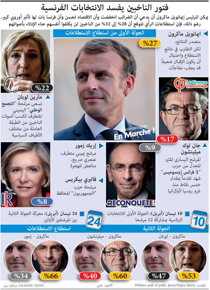 وتبدو فرص المرشحين العشرة الآخرين محدودة جداً، لكن عدم اليقين، يتواصل، إذ يؤكد الخبير السياسي باسكال بيرينو، أن «هذا الاقتراع هو الأول الذي تبلغ فيه نسبة الأشخاص المترددين أو الذين غيروا موقفهم هذا المستوى مع خمسين في المئة تقريباً».وقالت جان دين ماسيو وهي أستاذة موسيقى تبلغ الثامنة والثلاثين في سوق باريسي، أمس الأول، «الأمور بدأت ترتسم لكن بشكل مبهم لكن بصراحة سأتخذ قراري النهائي عندما أكون داخل العازل». ولا يزال الغموض يلف نسبة المقاطعة لهذا الاقتراع الذي ستكون نتائجه موضع ترقب كبير في أوروبا وخارجها.ويخشى الكثير من الخبراء السياسيين أن يتخطى مستوى المقاطعة في الدورة الأولى النسبة القياسية المسجلة العام 2002 وقدرها 28.4 في المئة أي أن تكون أعلى بكثير من النسبة المسجلة عام 2017 والبالغة 22.2 في المئة.وقالت كريستين مازو، وهي موظّفة متقاعدة تبلغ 75 عاماً في سوق في باريس، «لا أحد من محيطي سيصوّت».أثرت الحرب في أوكرانيا على الحملة التي انطلقت من دون حماسة لكنها انتعشت بعض الشيء في الأيام الأخيرة مع بروز فرضية احتمال فوز لوبن التي ستكون أول أمرأة وممثل لليمين المتطرف تصل إلى الرئاسة في حال فوزها. ونجحت لوبن ابنة جان ماري لوبن ممثل اليمين المتطرف على مدى عقود في فرنسا، في إظهار حزبها بصورة أكثر اعتدالاً مع شنها حملة مقنعة ركزتها على القدرة الشرائية التي يضعها المواطنون في أعلى سلم أولياتهم في حين يرتفع التضخم جراء الحرب في أوكرانيا.