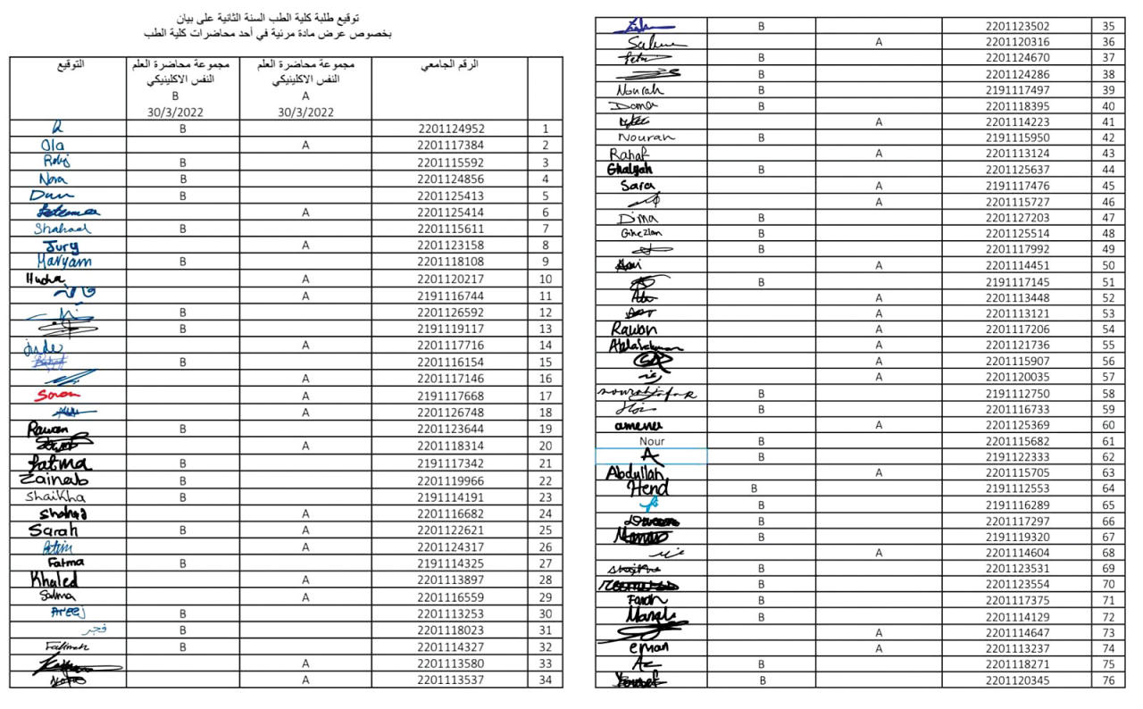 صورة ضوئية لتواقيع الطلبة عما تم عرضه في محاضرة كلية الطب