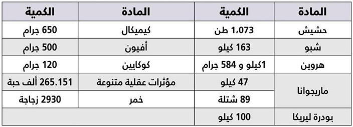وأوضحت أن الجهات الامنية المساندة ورجال المكافحة تمكنوا أيضا من ضبط 650 غراما من مادة الكيمكال المخدرة، و500 غرام من مادة الأفيون المخدرة، و120 غراما من مادة الكوكايين المخدرة.وبينت أن رجال المكافحة ضبطوا أيضا 265 ألفا و151 حبة مخدرة، بالاضافة إلى ضبط 2930 زجاجة خمر مستوردة. وأكدت الإدارة العامة لمكافحة المخدرات استمرارها في حملاتها الامنية بالتعاون والتنسيق مع جميع قطاعات والمؤسسات الأمنية المختصة لضبط كل من تسول له نفسه جلب أو الاتجار بالمخدرات والمؤثرات العقلية، وذلك من أجل حماية كل أفراد المجتمع والحفاظ عليهم من تجار ومروجي تلك الآفة المدمرة التي تستهدف شباب الوطن.