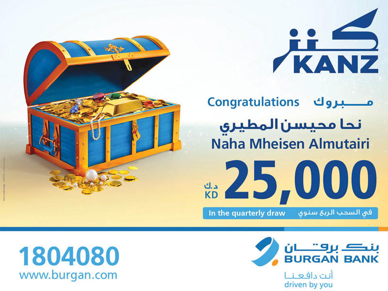 أعلن بنك برقان، اليوم، اسم الفائز المحظوظ في السحب ربع السنوي لحساب "كنز" وجائزته النقدية قيمتها 25.000 دينار، وهو نحا محيسن المطيري. ويدخل هذا السحب كل عملاء حساب "كنز" الذين يحافظون على رصيد أدنى قدره 5.000 دينار لمدة شهر واحد على الأقل قبل تاريخ السحب، وتزداد فرصهم في الفوز كلما ازاددت إيداعاتهم في الحساب.