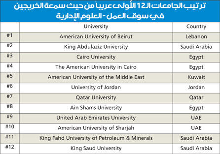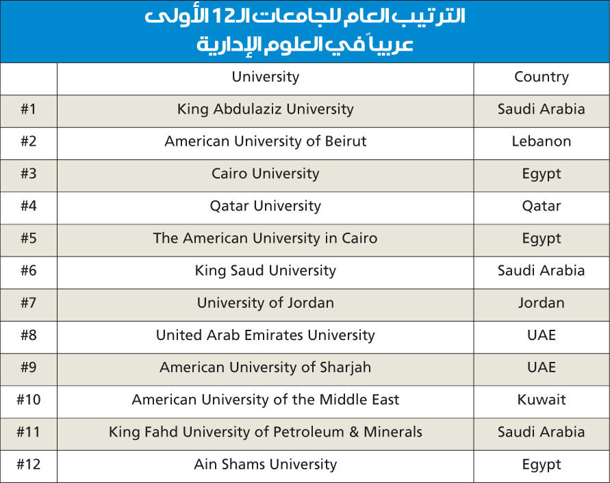على الصعيد العربي، أدرج هذا التصنيف نخبة من أرقى الجامعات العربية الرائدة في مجالات العلوم الإدارية، مثل جامعة الملك عبدالعزيز في السعودية، الجامعة الأميركية في بيروت، جامعة الإمارات العربية المتحدة، وغيرها، أما من الكويت فقد أدرجت جامعة واحدة وهي جامعة الشرق الأوسط الأميركية (AUM) التي حلّت في المرتبة السادسة خليجيا، العاشرة عربيا، وفي المرتبة 377 عالميا.