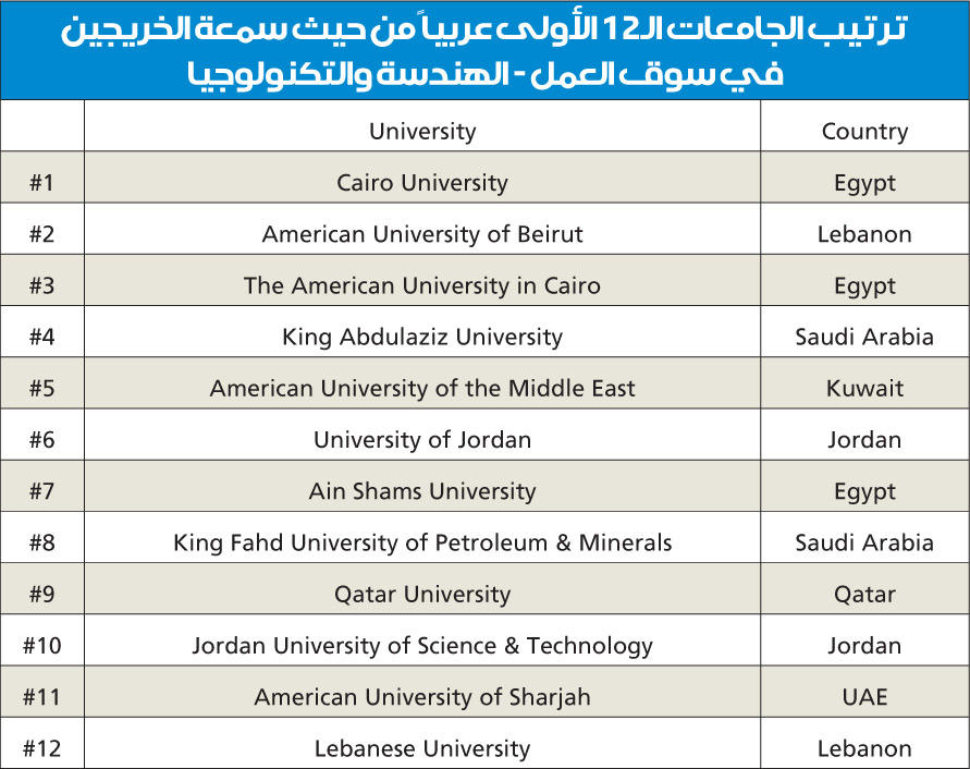 على صعيد الهندسة والتكنولوجيا، فإن جامعة الشرق الأوسط الأميركية (AUM) هي الوحيدة من الكويت التي انفردت بإدراجها ضمن أفضل 500 جامعة عالمية رائدة في مجالات الهندسة والتكنولوجيا، وهي التاسعة خليجيا، والسابعة عشرة عربيا.سمعة الخريجين في سوق العمل