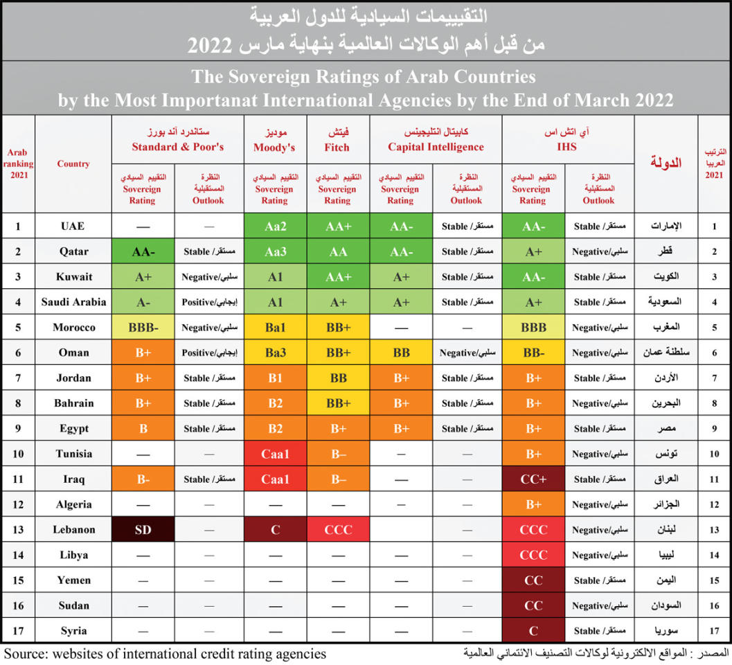 كشفت المؤسسة العربية لضمان الاستثمار وائتمان الصادرات (ضمان) عن استقرار وضع الدول العربية في التصنيفات الائتمانية السيادية لوكالات التصنيف الائتماني الرئيسية في العالم، وهي ستاندرد آند بورز وموديز وفيتش وكابيتال إنتليجينس واي إتش إس، لعام 2021، فيما عدا 5 دول شهدت تراجعا في تصنيفها لعام 2021 مقارنة بعام 2020.وأوضحت المؤسسة، في نشرتها الفصلية الأولى لعام 2022، أن 4 دول خليجية هي الإمارات والكويت وقطر والسعودية تصدّرت التصنيفات العربية خلال عام 2021، وذلك بحصولها على مستوى A بدرجاته المختلفة، في حين حصلت 6 دول هي سلطنة عمان والأردن والبحرين ومصر والمغرب والجزائر على تصنيف متوسط بمستوى B بدرجاته المختلفة، وتراوح تصنيف العراق وتونس بين المستويين B وC، فيما تم تصنيف 5 دول في المستوى C، بينما لم يتم تصنيف 5 دول هي موريتانيا، والصومال، وجيبوتي، وفلسطين وجزر القمر.أما على صعيد مؤشرات قياس مخاطر الدول السياسية والاقتصادية والمالية والتشغيلية، فقد أظهر تقرير متخصص أعدته المؤسسة عن التغيرات التي طرأت على وضع تلك الدول بين عامي 2020 و2021 في 10 مجموعات من المؤشرات الصادرة عن أبرز الوكالات المتخصصة في هذا المجال لعام 2021 ما يلي: • تحسّن الوضع العام للدول العربية في مؤشرَي فيتش وPRS لقياس مخاطر الدول السياسية والاقتصادية والمالية والتشغيلية في الآجال القصيرة والمتوسطة والطويلة كمحصلة لتراجع المخاطر بين 13 و16 دولة عربية.