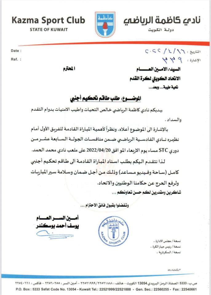 طالب نادي كاظمة بإسناد مهمة التحكيم في المباراة المقبلة أمام القادسية إلى حكام أجانب، بما في ذلك حكام الفار، حيث سيلتقي "البرتقالي" مع "الأصفر" بعد غدٍ، ضمن منافسات الجولة الـ17 من منافسات الدوري الممتاز لكرة القدم.ويحتل كاظمة وصافة الدوري الممتاز بـ34 نقطة، متخلفا بفارق نقطتين عن الكويت صاحب الصدارة، في حين يتواجد القادسية بالمركز الرابع بـ29 نقطة.وأرجع كاظمة طلبه، في الكتاب المذيل بتوقيع أمين السر يوسف بوسكندر، إلى أهمية المباراة، وضمان وسلامة سيرها، إلى جانب رفع الحرج عن الحكام الوطنيين والاتحاد.