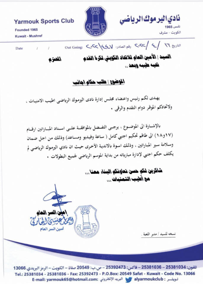 في سياق متصل، طالب مسؤولو اليرموك بطاقم حكام أجانب كامل أيضا يضم حكم ساحة، ومساعدين، وتقنية حكم الفيديو المساعد، في المباراتين المقبلتين، نظرا لأهميتهما وحساسيتهما.ومن جهة اخرى، استقرت لجنة المسابقات باتحاد كرة القدم على حسم مصير موعد الجولة الأخيرة من منافسات دوري stc الممتاز، وفقا لما ستسفر عنه نتائج الجولة السابعة عشرة للبطولة.وتقرر إقامة المباريات الخمس للجولة الأخيرة يوم 25 الجاري، في حال حسم نادي الكويت اللقب لمصلحته، نظرا لوجود سيارتين فقط لتقنية حكم الفيديو المساعد، وبالتالي تخصيصهما لمباريات الفرق المهددة بالهبوط، في ظل حساسية المواجهات.