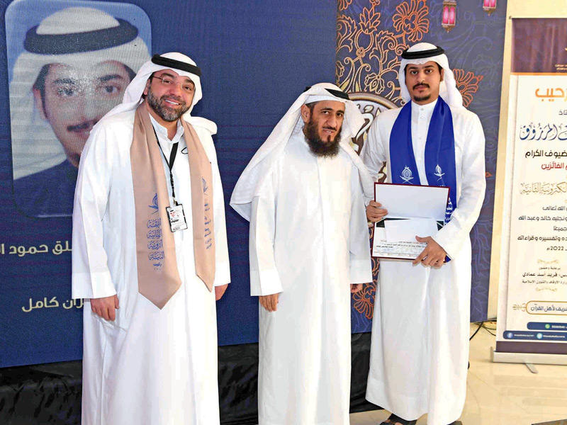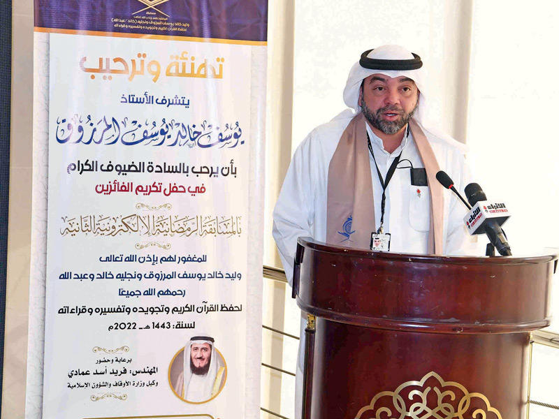 من جانبه، قال المشرف العام على حلقات المغفور له بإذن الله العم خالد يوسف المرزوق، الزميل يوسف عبدالرحمن: قبل 10 سنوات انطلقت حلقات العم خالد يوسف المرزوق، يرحمه الله، لحفظ القرآن وتفسيره، لتسدّ فراغا كبيرا للشباب في الكويت، وأثمرت تخريج 106 حفاظ للقرآن حصلوا على السند المتصل إلى رسول الله صلى الله عليه وسلم.وأضاف قائلا: في 2 رمضان 1442هـ الموافق 15 أبريل 2021م انطلقت مسابقة وليد خالد المرزوق ونجليه خالد وعبدالله، يرحمهم الله، واليوم نحتفي بـ 63 فائزا متفوقا في هذه المسابقة الإلكترونية المباركة في عامها الثاني، والتي نأمل بإذن الله أن تكون في العام المقبل للجنسين رجالا ونساء، والشكر في هذا الأمر لداعم هذه الحلقات المباركة والمسابقة الأخ فواز خالد المرزوق، الحريص على دينه المتبع لسنة نبيه الكريم، المجتهد في مرضاة ربه تعالى، الوفي لأمواته وأرحامه وأهله وأحبابه، والقائل دائما «الكويت تستاهل».ووجّه الزميل يوسف عبدالرحمن الشكر إلى وزارة الأوقاف، وعلى رأسها الوزير عيسى الكندري، واستعرض عددا من إنجازات المسابقة بالأرقام والإحصاءات، حيث أشار إلى أن عدد المشاركين في المسابقة في عامها الثاني بلغ 1117 متسابقا من مختلف الجنسيات، بينهم 50 كويتيا و1027 متسابقا من الجنسيات العربية، ومن الجنسيات غير الناطقة باللغة العربية حوالي 40 متسابقا.وأوضح أنه بدأ التجهيز للمسابقة من تاريخ الأول من شعبان 1443هـ، وحتى التاسع عشر من شهر رمضان، حيث تم تصميم البوسترات وإنشاء الروابط الإلكترونية وصفحات على مواقع التواصل لمتابعة أخبار المسابقة إلكترونيا بواقع 30 رابطا.وذكر عبدالرحمن أن المسابقة تشتمل على 7 فئات مختلفة، ومنها فئة القراءات العشر التي تعد إضافة جديدة للمسابقة، وفئة القرآن كاملا، ونصف القرآن، وذوو الاحتياجات الخاصة، وربع القرآن للشباب، و5 أجزاء للناشئة، وجزء عمّ وتبارك للبراعم.الخراز: استمرار المسابقة وتنامي عدد المشاركين دليلان على نجاحها