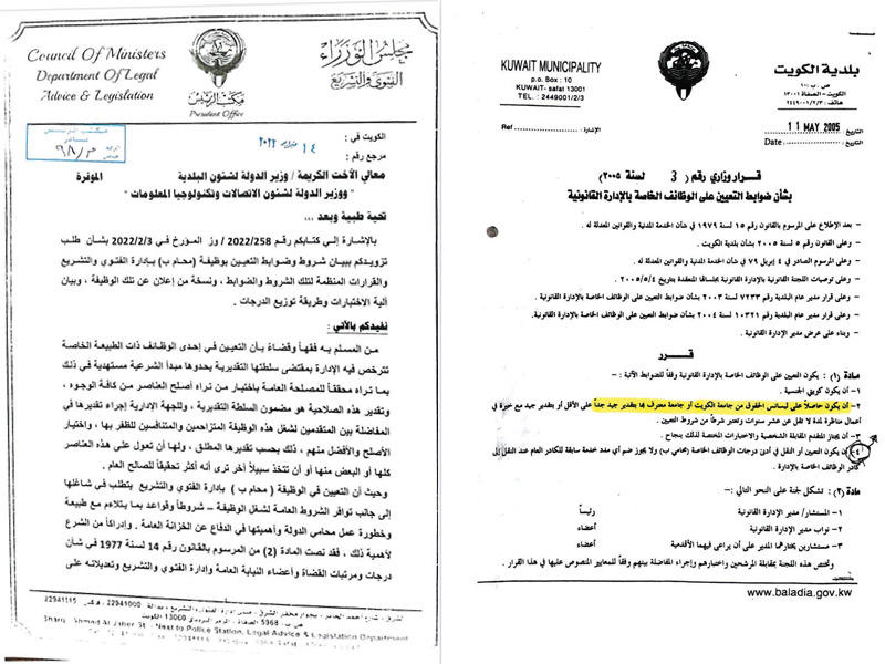 واستشهدت المصادر بكتاب وزير البلدية عام 2005 أحمد باقر عند الإعلان عن تعيينات البلدية بأنه يشترط أن يكون من خريجي كلية الحقوق فقط لإيمان الوزير السابق بأهمية الوظيفة مما يؤكد بأن المسلك المتبع في تعيينات الإدارة القانونية ببلدية الكويت هو قصر التعيين على خريجي كلية الحقوق فقط.ولفتت المصادر إلى أن الأعمال المتوسطة في عمل الإدارة القانونية تتعلق بكتاب الطعون والمذكرات القانونية والترافع أمام المحاكم والتحقيقات القانونية، ومثل هذه الأعمال لا يمكن أن يمارسها سوى القانونيين.وقالت المصادر، إن الإدارة القانونية عانت سنوات طويلة ولا يمكنها الآن أن تعاني بسبب الكوادر التي سيتم تعيينها نتيجة عدم تأهيلها من الناحية التخصصية، لاسيما أن الأعمال التي سيقوم بها المحامون قانونية لا إدارية ليتسنى القيام بها من أي من الموظفين.كما أن ضوابط ديوان الخدمة المدنية، التي اعتمدتها أسوة بضوابط الفتوى والتشريع تعني إجراء الإدارة الاختبارات التحريرية للمقابلات الشخصية وهي جميعها تقوم بمخاطبة القانونيين بها وليس سواهم من التخصصات. وطالبت المصادر وزير البلدية بمراجعة الإعلان المنشور بتعيين المحامين في البلدية، بسبب مخالفته قواعد التعيين التي اعتمدها ديوان الخدمة المدنية، فضلاً عن حاجة العمل الفعلية لأصحاب التخصصات القانونية لسد النقص الذي تعاني منه الإدارة القانونية، فضلاً عن الالتزام بالسوابق الخاصة بالتعيين في الإدارات القانونية ومنها البلدية التي التزمت بتعيين خريجي الحقوق لأن الأعمال التي يقوم بها المحامون لا يمكن للتخصصات الأخرى القيام بها، وان التعيين لخريجي الشريعة يعني عملياً عدم إمكانية الاعتماد عليهم مستقبلاً في عمل الإدارة نظير عدم تأهيلهم القانوني أو قدرتهم على كتابة الطعون أو المذكرات القانونية أو الترافع أمام المحاكم وفق ما تقتضيه الأحكام القضائية ومنها المرافعات.