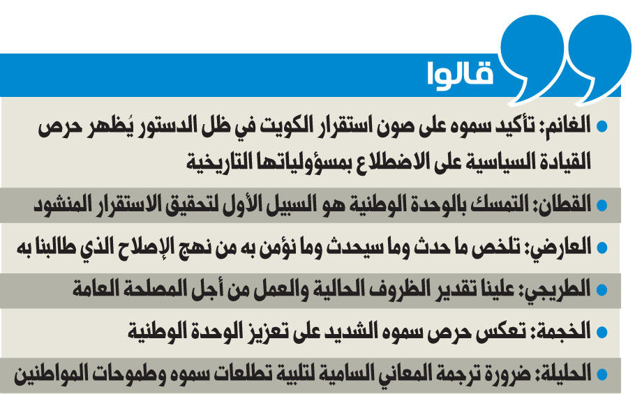 وأضاف: "إن تأكيد سموه على صون أمن واستقرار الكويت في ظل النهج الديمقراطي والدستور هو تأكيد على حرص القيادة السياسية على الاضطلاع بمسؤولياتها التاريخية، التي هي أهل لها ولحملها بكل أمانة واقتدار".واختتم الغانم تصريحه، قائلا: "سموه، كعادته، وضع النقاط على الحروف، وركز على التحديات التي تواجه البلاد والعباد، ولا نملك إلا أن نقول وكلنا ثقة: سمعا وطاعة يا سمو الأمير".من ناحيته، اعتبر رئيس مجلس الأمة بالإنابة النائب حمد سيف، أن كلمة سمو أمير البلاد الشيخ نواف الأحمد، التي ألقاها سمو ولي العهد الشيخ مشعل الأحمد، بمناسبة العشر الأواخر، هي كلمة أب لأبنائه، مؤكداً "ثقتنا في سموه وسمو ولي العهد في اتخاذ القرار المناسب للحفاظ على مكتسبات وطننا وأمنه واستقراره". ودعا الهرشاني المواطنين إلى الانتباه، وتحمُّل المسؤولية الوطنية، والالتفاف حول قيادة صاحب السمو الشيخ نواف الأحمد، وسمو ولي العهد الشيخ مشعل الأحمد، و"التصدي لما يدور حالياً على الساحة من البعض من بذاءات وتشهير وتصفية حسابات شخصية وطعن في الذمم والشرف وأساليب دخيلة على الكويتيين، ليست من تربيتنا منذ مئات السنين، وممارسات ليس لها أي علاقة بالمصلحة العامة".وشدد على أنه "يجب نبذ هذه الممارسات، من أجل مصلحة بلدنا وأمنه ووجوده واستقراره، ويجب العمل والتكاتف والتعاون لحماية أمن بلدنا، من أجل المستقبل، مثل دول الجوار، في ظل الظروف غير المستقرة الإقليمية والدولية والاقتصادية".بدوره، قال أمين سر مجلس الأمة النائب فرز الديحاني: "جاء في كلمة سمو أمير البلاد، التي ألقاها بالنيابة عن سموه، سمو ولي العهد الشيخ مشعل الأحمد، أن (الكويت أمانة في أعناقنا)، ونحن نعمل جاهدين من أجلها وشعبها والبقاء متمسكين بدستورها".من جانبه، أكد النائب د. علي القطان، أن "كلمة سمو نائب الأمير في العشر الأواخر من رمضان، هي خريطة طريق لنا جميعاً، حيث أكد أن أمن واستقرار البلد مسؤولية في أعناق القيادة، وأن لُحمة الكويتيين، والتي تتمثل في التمسك بالوحدة الوطنية، هي السبيل الأول لتحقيق الاستقرار المنشود".من ناحيته، رأى النائب أسامة الشاهين أن "خطاب سمو أمير البلاد - أناب سمو ولي عهده - في العشر الأواخر من الشهر الفضيل، من الاحتفاء الجميل والاستشعار الجليل لشعائر الإسلام ومناسكه، وإحياء عملي لواجب النصيحة للمسلمين". بدوره، قال النائب مساعد العارضي: "من كلمة صاحب السمو، والذي ألقاها سمو ولي العهد، (للإصلاح خطوات ومسارات، وأنه لا يحدث بين ليلة وضحاها، وسيظل بحاجة إلى جهد جهيد وصبر جميل)، تلخص ما حدث وما سوف يحدث وما نؤمن به ولا نتخلى عنه، وهو نهج الإصلاح الذي طالبنا به، وبدأنا به وفق مشروع وطني عليه رقابة شعبية تقومه".من ناحيته، ذكر النائب د. عبدالله الطريجي أن "تأكيد صاحب السمو، الذي نقله عنه سمو ولي العهد، أنه لن يتوانى عن اتخاذ أي قرار يضمن استقرار الكويت، يفرض علينا تقدير الظروف الحالية، والعمل من أجل المصلحة العامة، وأن نترجم دعوة سموه بأن نفتح قلوبنا للصفاء والتعاون، ونحافظ على الوحدة الوطنية".من جانبه، قال النائب أحمد الحمد: "سمو الأمير الشيخ نواف الأحمد، في كلمته الموجزة الجامعة الموجهة لأهل الكويت، والتي ألقاها نيابة عنه سمو ولي العهد الشيخ مشعل الأحمد، يدعو إلى التعاون وسلامة الصدور والتعاون"، مضيفا: "سموه يؤكد أن الوحدة الوطنية هي الحصن الذي يحمي الوطن وأهله، والأزمات أثبتت معدن الكويتيين الأصيل، ويؤكد حرصه على استقرار الوطن ومصالح أهله".بدوره، أكد النائب مبارك الخجمة أن "كلمة سمو الأمير تعكس حرصه الشديد على تعزيز الوحدة الوطنية، باعتبارها السياج الواقي لأمن واستقرار البلاد، وتأتي كلمته أيضا تجسيدا لرؤى وقناعات سموه، وإيمانه بالبناء الديموقراطي لنهضة وتقدم البلاد وتنميتها".من جانبه، رأى النائب خليل الصالح أن "كلمة سمو أمير البلاد، بمناسبة العشر الأواخر، التي ألقاها نيابة عن سموه سمو ولي العهد، عبَّرت عن المشاعر الأبوية الصادقة 