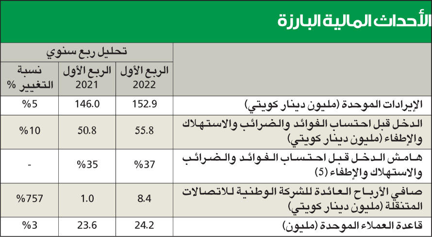 أعلنت الشركة الوطنية للاتصالات المتنقلة «Ooredoo» أمس، نتائجها المالية للربع الأول من سنة 2022 وبلغ صافي الربح العائد للشركة في تلك الفترة 8.4 ملايين دينار مقارنة بـ 1.0 مليون لنفس الفترة من سنة 2021 حيث استمد دعماً قوياً من تحسن الإيرادات التشغيلية والمالية من «Ooredoo» الكويت و«Ooredoo تونس» و«Ooredoo الجزائر» و«Ooredoo فلسطين» و«Ooredoo المالديف».وقالت الشركة إن الدخل قبل احتساب الفوائد والضرائب والاستهلاك والإطفاء ارتفع بنسبة 10 في المئة لتصل إلى 56 مليون دينار للربع الأول من سنة 2022 مقارنة بـ 51 مليوناً للربع الأول من 2021.وارتفعت الإيرادات الموحدة بنسبة 5 في المئة لتصل إلى 153 مليون دينار للربع الأول من سنة 2022 مقارنة بـ 146 مليوناً لنفس الفترة من 2021.