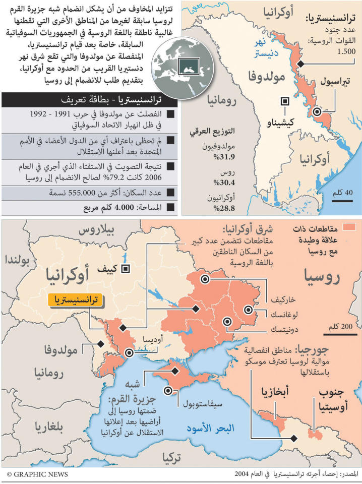 إلى ذلك، وفي أحداث قد تتسبب بتوسع الحرب، أمر رئيس جمهورية ترانسنيستريا الانفصالية المعلنة من جانب واحد والموالية لموسكو، بتشديد الإجراءات الأمنية في هذه المنطقة المولدوفية المتاخمة لجنوب غرب أوكرانيا.وبعد أيام من تصريح لجنرال روسي قال، إن السيطرة على جنوب أوكرانيا ضروري للقوات الروسية للوصول إلى ترانسنيستريا، مما أثار مخاوف دولية من توسع الصراع، أعلنت السلطات الانفصالية في الساعات الأخيرة أنّ مقرّ وزارة الأمن العام في العاصمة تيراسبول تعرّض أمس الأول، لهجوم بقاذفات قنابل يدوية لم يسفر انفجارها عن إصابات.كما أعلنت تعرض وحدة عسكرية انفصالية بالقرب من مدينة تيراسبول إلى «هجوم إرهابي» دون تقديم توضيحات، بينما أطاح انفجاران ببرجين إذاعيين من العصر السوفياتي.وعبّر الكرملين عن قلق بالغ، وقال إن موسكو تتابع الأحداث عن كثب.في المقابل، عقدت رئيسة مولدوفا مايا ساندو، أمس، اجتماعاً طارئاً لمجلس الأمن الأعلى في بلادها لبحث التطورات. ولروسيا وجود عسكري دائم في ترانسنيستريا منذ انهيار الاتحاد السوفياتي. وتخشى أوكرانيا من استخدام المنطقة في شن هجمات روسية جديدة على أراضيها.