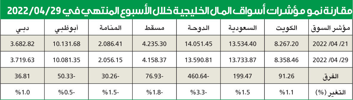 تباينت محصلة أداء مؤشرات الأسواق المالية بدول مجلس التعاون خلال تعاملاتها الأسبوع الماضي، وهو الأسبوع الأخير في الشهر الأول من الربع الثاني (أبريل)، وكذلك تداولات شهر رمضان المبارك، وربحت 3 مؤشرات بقيادة مؤشر السوق السعودي (تاسي) أكبر مؤشرات الأسواق المالية بالشرق الأوسط، حيث حقق نموا بنسبة 1.5 بالمئة، كما رافقه مؤشرا الكويت ودبي بنمو متقارب بنسبة 1.1 و1 بالمئة على التوالي.في المقابل تراجعت 4 مؤشرات وبنسب متفاوتة، كان أكبرها خسارة مؤشر السوق القطري، حيث فقد نسبة 3.3 بالمئة، تلاه مؤشرا عمان والبحرين بخسارة متقاربة كانت 1.8 و1.5 بالمئة على التوالي، واستقر مؤشر سوق أبوظبي المالي على تراجُع محدود بنسبة نصف نقطة مئوية فقط.