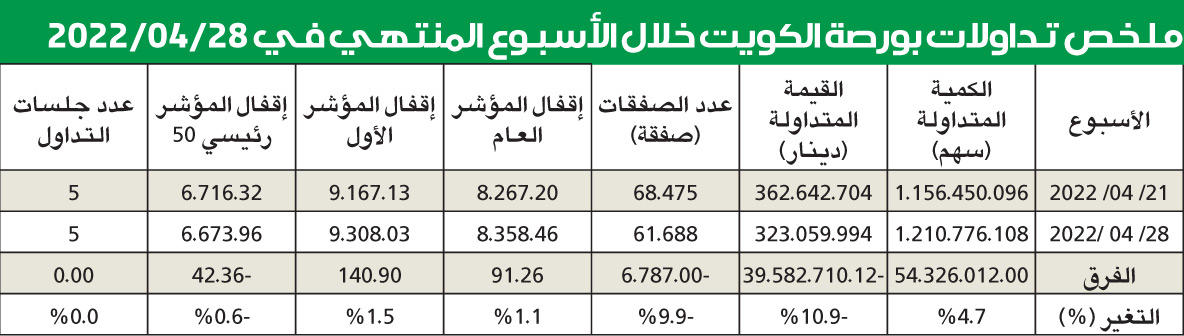 ربحت مؤشرات بورصة الكويت الرئيسية بنسب جيدة الأسبوع الأخير من رمضان وحقق مؤشر السوق العام ارتفاعا بنسبة 1.1 بالمئة أي 91.26 نقطة، ليبلغ مستوى 8358.46 نقطة، وهو أعلى مستوياته منذ إطلاقه قبل 9 سنوات، وكانت مكاسب مؤشر السوق الأول أكبر، حيث بلغت 1.5 بالمئة، أي 140.9 نقطة، ليبلغ مستوى قياسيا أيضا هو 9308.03 نقاط، وتبلغ مكاسبه لهذا العام 21.8 بالمئة كأكبر مكاسب لمؤشر خليجي، بالمقابل تراجع مؤشر رئيسي 50، وخسر نسبة محدودة هي 0.6 بالمئة، أي 42.36 نقطة، ليقفل على مستوى 6673.96 نقطة.وتباين أداء متغيرات السوق الثلاثة (السيولة والنشاط وعدد الصفقات)، حيث ارتفع النشاط مقارنة مع الأسبوع الأسبق بنسبة 4.7 بالمئة مقابل تراجع السيولة بنسبة 11 بالمئة تقريبا وعدد الصفقات بنسبة 10 بالمئة، وسيطرت نتائج أعمال الشركات وأخبار بعض القضايا المهمة على الأداء، وكان سهم "زين" الأفضل بين الشركات القيادية، بعد إعلان جيد للربع الأول، كما تحرّك أجيليتي إيجابا، وهو المحمل بالأرباح وقرار زيادة رأس المال أيضا، وصعد "أهلي متحد"، واستقرت الشركات القيادية كالوطني وبيتك، وشهدت الأسهم المتوسطة حراكا كبيرا، خصوصا الوطنية العقارية وجي إف إتش وإس تي سي، ومن الأسهم الصغيرة كان أبرزها سهم الأولى، لتنتهي الجلسات الرمضانية على أفضل سيناريو.وكان سوق دبي المالي هو ثالث الأسواق الخضراء خلال الأسبوع الماضي، حيث ربح نسبة 1 بالمئة، أي 36.81 نقطة، ليصل الى مستوى 3719.63 نقطة، وتواصل تدفق بيانات الربع الأول الإيجابي في سوق دبي، وبلغ عدد الشركات المعلنة 9 شركات، ويذكر انها جميعا حققت نموا، وكان نموها الإجمالي نسبة 43 بالمئة، مما خلق دعما لمؤشر السوق والأسهم المعلنة، وأعطى تفاؤلا لبقية الشركات التي لم تعلن حتى نهاية شهر أبريل.«قطر»... خسارة كبيرة