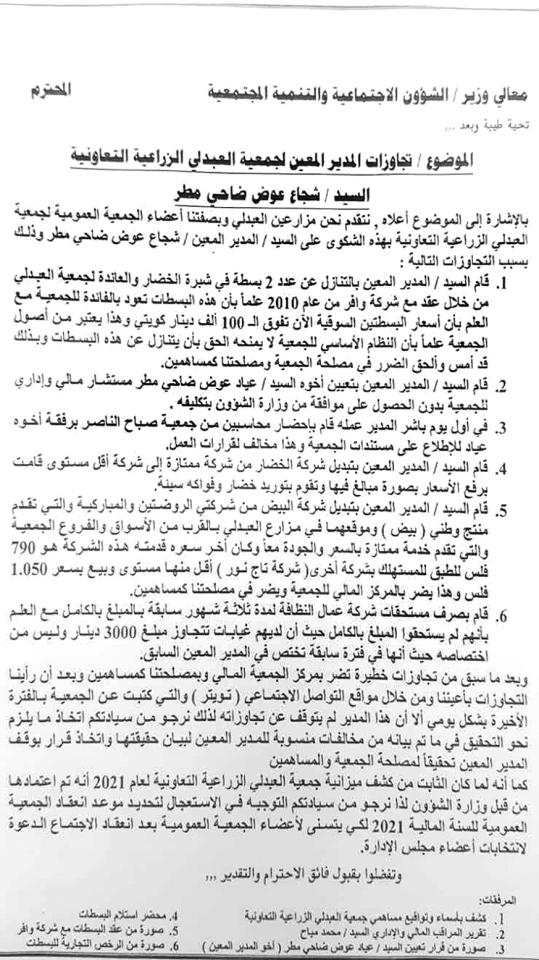 بدأت التداعيات السلبية لمسلسل التعيينات العشوائية والمتسرّعة داخل مجالس إدارة الجمعيات التعاونية، الصادرة أخيراً عن وزير الشؤون الاجتماعية والتنمية المجتمعية، وزير الدولة لشؤون الإسكان والتطوير العمراني، مبارك العرو، تتكشف، لتظهر كمّا من التجاوزات التي أثارت حفيظة المساهمين، وحدت بهم الى إعلان انتفاضة واسعة ضدها، لاسيما لأنها تعبق برائحة التكسبات الشخصية، وقد تجلى ذلك في تقدّم عشرات المزارعين من مساهمي جمعية العبدلي التعاونية بشكوى جماعية ضد مديرها المعيّن من قبل العرو، تضمنت ما أسموه "جُملة تجاوزات" اقترفها منذ توليه مهام الجمعية في مارس الماضي.ووفقا للشكوى، التي حصلت "الجريدة" على نسخة منها، والمذيّلة بتوقيع 62 مساهما بالجمعية، فإن المدير المعيّن تنازل عن بسطتين في "شبرة الخضار" تعود تبعيتهما لجمعية العبدلي بناء على عقد موّقع مع شركة وافر منذ 2010، وتزيد قيمتهما المالية على الـ 100 ألف دينار، وتعتبران من أصول الجمعية الثابتة، في مخالفة صارخة للنظام الأساسي الذي لا يمنح المدير حق التنازل عن البَسطتين، مما ألحق ضرراً مالياً بالغاً بالجمعية ومصلحة المساهمين.