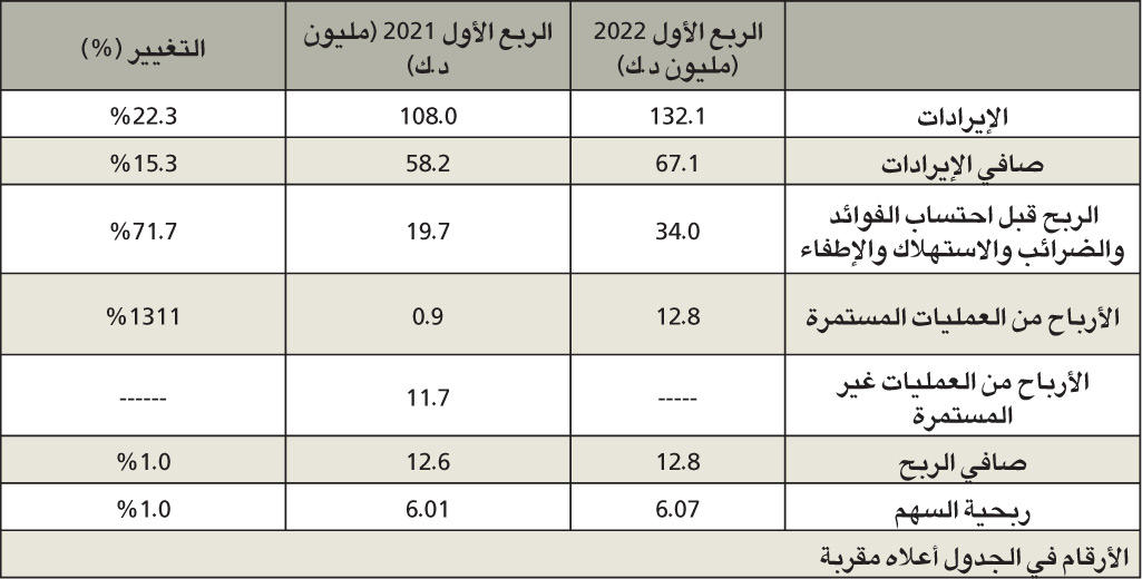 أعلنت شركة أجيليتي، اليوم، نتائجها المالية للربع الأول من عام 2022، محققة صافي أرباح بقيمة 12.8 مليون دينار، وربحية سهم 6.07 فلوس للسهم الواحد، بزيادة 1 في المئة عن نفس الفترة من عام 2021، والذي يتضمن أرباحا من العمليات غير المستمرة.أما الأرباح من العمليات المستمرة فقد نمت بنسبة 1311 في المئة، وبلغت الأرباح قبل احتساب الفوائد والضرائب والاستهلاك والإطفاء 34 مليون دينار، بزيادة نسبتها 71.7 في المئة، بينما بلغت الإيرادات 132.1 مليونا، محققة زيادة بنسبة 22.3 في المئة.