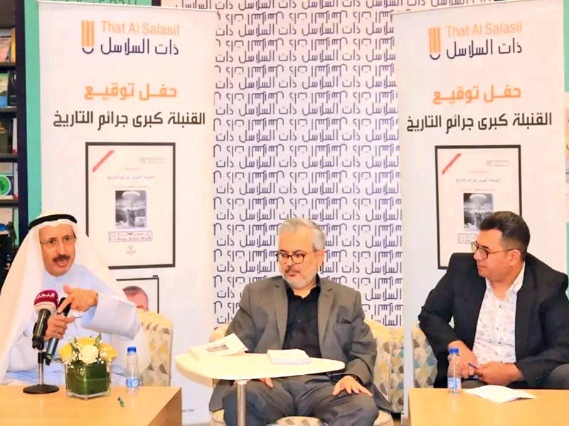 أقامت مكتبة ذات السلاسل في "الأفنيوز" حفل توقيع لكتاب "القنبلة: كبرى جرائم التاريخ" للدكتور حمد العيسى، وأدار النقاش خلال الحفل الكاتب صالح الغازي، وشهد حضور وزير الإعلام والمواصلات السابق سامي النصف، والمهتمين بالشأن الثقافي.في البداية، قدم الغازي نبذة عن الكاتب، ثم أعرب د. العيسى عن سعادته باستضافة "دار السلاسل"، وشكر المدير التنفيذي سعود المنصور على ترتيب هذا اللقاء، ونشر الكتاب بصورة ممتازة، ثم أعطى سيرة موجزة عن الكاتب.وقال د. العيسى: "أتشرف اليوم بتقديم ترجمتي لكتاب القنبلة: كبرى جرائم التاريخ للمؤلف البروفيسور هوارد زن، وهو مفكر ومؤرخ أميركي يساري من مواليد 1922، وتوفي عام 2010، وحصل على الدكتوراه في التاريخ من جامعة كولومبيا عام 1958، تخصص التاريخ، وتخصص فرعي في العلوم السياسية، وكرس المؤلف نفسه لخدمة الحقوق المدنية، وحقوق الإنسان، ومناهضة الحروب، وحظر الأسلحة النووية، ومناهضة استعمال القنابل الفتاكة حتى في حالة وقوع حروب".وأشار إلى أن الكتاب الأصلي لا يحتوي على أية صور، بل إن جميع الصور التي في هذا الكتاب، وعددها 229، من إعداده، وأيضا الكتاب الأصلي الإنجليزي لا يحتوي على أية هوامش أسفل الصفحات، وجميع الهوامش وعددها 41 من إعداده أيضا.