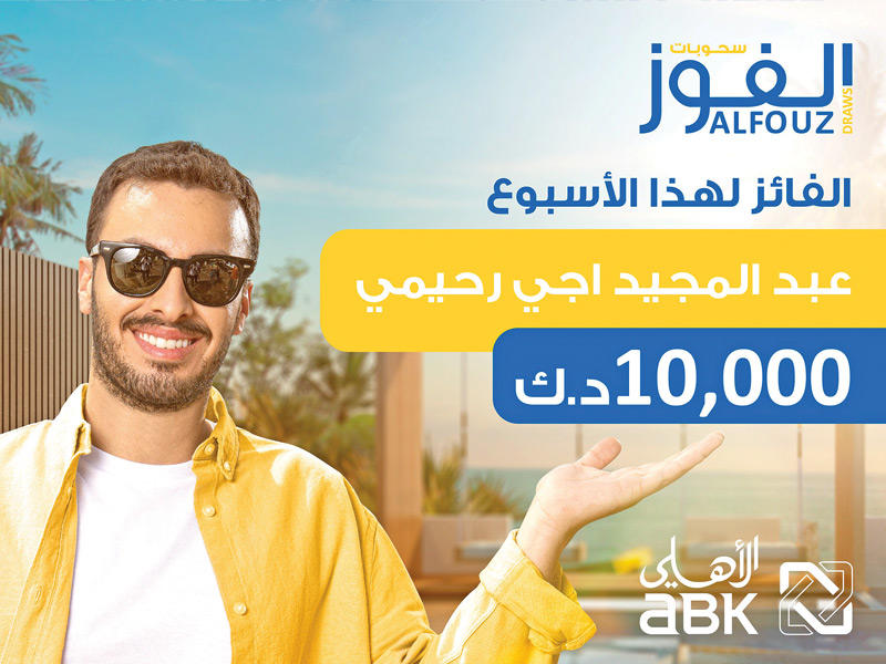 أعلن البنك الأهلي الكويتي فوز عبدالمجيد اجي رحيمي في السحب الأسبوعي لحساب "الفوز" للجوائز، بجائزة نقدية قدرها 10 آلاف دينار، والذي أقيم بإشراف وزارة التجارة والصناعة، وتم إعلان اسم الفائز أمس.وحساب "الفوز" للجوائز، هو حساب الجوائز الأول من نوعه الذي يتيح لعملاء البنك فرصة الفوز بجوائز ومكافآت كبرى. ومن خلال حساب "الفوز"، سيحظى عملاء البنك بفرصة الفوز بـ 10 آلاف دينار ضمن السحب الأسبوعي الأعلى لفائز واحد في الكويت، كذلك فرصة للفوز بالجائزة الكبرى، وهي راتب شهري بنحو 5 آلاف دينار لمدة 10 سنوات.