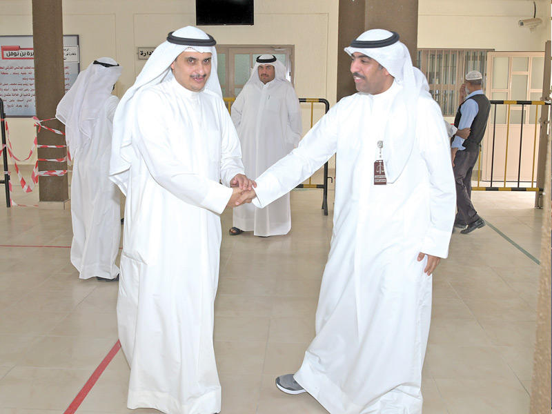 المحري برفقة أحد الناخبين في مركز مدرسة معن بن زائدة أمس (تصوير نوفل إبراهيم)