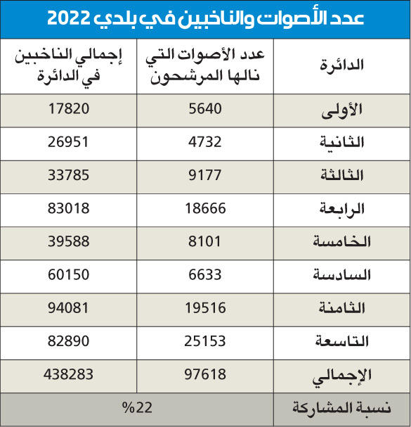 بينما لم تشهد انتخابات «بلدي 2022» أي مفآجات في النتائج المتوقعة، التي جاءت بنسبة تغيير بلغت 70 في المئة، وسط مشاركة تصل إلى 22 في المئة، أجمع الأعضاء الفائزون في السباق على تكاتفهم للدفع بالقضايا والملفات التي تساهم في تطوير النهضة العمرانية والتنموية بالبلاد، وطرح المزيد من الأراضي للقضية الإسكانية التي تعتبر أولوية لدى الناخبين، مشيدين بنجاح العرس الديموقراطي وحسن سير العملية الانتخابية. وجدد عضو «البلدي» الفائز عن الدائرة الثانية عبدالله المحري، في تصريح لـ «الجريدة»، نيته خوض سباق رئاسة المجلس عقب اكتساحه الانتخابات بفارق 3 آلاف صوت، قائلاً: «انتهينا من السباق الانتخابي، والآن أمامنا استحقاق خوض انتخابات الرئاسة».وذكر المحري أنه شهد عرسا ديموقراطيا جديدا أُجري على أكمل وجه بحضور الناخبين الساعين إلى تحقيق التطوير، معرباً عن شكره لهم على تجديد الثقة، التي تُعد بحد ذاتها مسؤولية ضخمة.