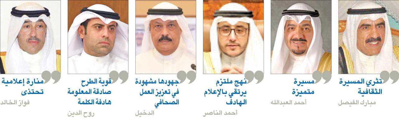 بدوره، تمنى رئيس مجلس الوزراء سمو الشيخ صباح الخالد لـ "الجريدة" تحقيق المزيد من النجاحات التي تسهم في تعزيز المسيرة الإعلامية والصحافية للكويت، مشيداً بجهودها في نشر الوعي الثقافي والاجتماعي من أجل خدمة الوطن والمواطنين.وأشاد وزير الخارجية الشيخ د. أحمد الناصر بالنهج الملتزم الذي انتهجته "الجريدة" سبيلاً للارتقاء بالصحافة الوطنية والإعلام الهادف، متمنياً لها دوام التألق في القادم من الإصدارات لما فيه خير المسيرة الإعلامية المسؤولة.وفي تهنئته، أعرب وزير الإعلام د. حمد روح الدين عن تقديره دور "الجريدة" الكبير وما تقدمه من موضوعات مهمة "من شأنها إعلاء مصالح وطننا الحبيب من خلال قوة الطرح وصدق المعلومة والكلمة الهادفة والتي أثبتم من خلالها حرفية صحافية راقية وطرحاً مميزاً وتوازناً إعلامياً". وبينما تمنى رئيس الديوان الأميري الشيخ مبارك الفيصل لـ"الجريدة" مواصلة المزيد من النجاحات الإعلامية، وأن تضطلع بدورها في إثراء وتعزيز المسيرة الثقافية، تمنى رئيس ديوان سمو ولي العهد الشيخ أحمد العبدالله لها مزيداً من التفوق والسداد ومواصلة مسيرتها المتميزة، في وقت أعرب رئيس ديوان رئيس مجلس الوزراء عبدالعزيز الدخيل عن خالص تقديره لجهودها المشهودة في تعزيز العمل الصحافي ونشر الوعي بين أبناء المجتمع.وفي برقيته، تمنى محافظ الأحمدي الشيخ فواز الخالد لـ"الجريدة" مواصلة مسيرتها المتميزة عبر الطرح المتزن والرؤية الصائبة والكلمة الحرة، وأن يتواصل عطاؤها المهني والخلاق ومواكبتها الفاعلة على الساحة التنموية والفكرية والثقافية كمنارة إعلامية فاعلة تحتذى. وقال وكيل وزارة الإعلام سعود الخالدي إن "الجريدة"استطاعت أن تتبوأ مكانتها المرموقة بين الصحف المحلية والدولية بفضل الجهود المتميزة لأسرتها وحرصهم على الموضوعية والحرفية الاعلامية، في حين أعرب وكيل الحرس الوطني الفريق الركن هاشم الرفاعي عن خالص تهنئته وتمنياته بالتوفيق.في السياق، أشاد المدير العام لبنك الائتمان صلاح المضف بما تتضمنه "الجريدة" من ذلك العدد الكبير من الكتاب الذين يتنوعون بين قادة الفكر والقلم ورجال السياسة والأدب مانحين هيبة للكلمة، "فلم تكن مجرد جريدة وإنما مدرسة ضمت العديد من الأساتذة وأخرجت للصحافة العديد من أصحاب الأقلام المعروفين".وبينما أشاد رئيس مجلس إدارة جمعية أهالي الشهداء الأسرى والمفقودين فايز العنزي بدعم "الجريدة" الدائم والمتواصل لقضية الشهداء والأسرى والمفقودين بشكل عام، وأنشطة الجمعية وفعالياتها بشكل خاص، أعرب المدير العام لمعهد الدراسات المصرفية د. يعقوب الرفاعي عن تقديره لمسيرة "الجريدة" الإعلامية، وما حققته من إنجازات خلال السنوات السابقة حتى أصبحت تحتل مكانة رائدة بين كبرى الصحف في عالم الصحافة والإعلام.من جهتها، تقدمت رئيسة الاتحاد الكويتي للجمعيات النسائية الشيخة فادية سعد العبدالله بأطيب التهاني، داعية لـ "الجريدة" بالتوفيق لمزيد من الرقي والنجاح، لما فيه خير ومصلحة بلدنا الحبيب.وقال سفير سلطنة عمان د. صالح الخروصي إن "الجريدة" استطاعت تحقيق النجاحات الرائعة التي وصلت إليها عبر سياستها المتزنة في تناول مختلف القضايا بكل شفافية ومهنية مميزة، مشيداً بالدور الفاعل والملموس الذي طالما قامت به للتعريف بالوجه الحضاري المشرق للسلطنة.ووصف القائم بالأعمال في السفارة السورية بالكويت الوزير المستشار مصطفى ديوب مسيرة "الجريدة" بأنها مسيرة من العمل الإعلامي الملتزم بقضايا الأمة العربية والقضية الفلسطينية، ومن الحياد والإيجابية في التعامل مع مختلف القضايا العربية والإسلامية.