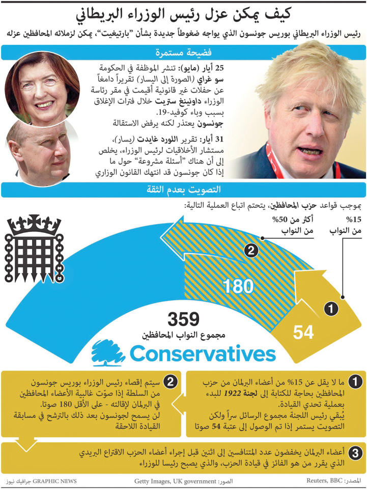 ذكرت صحيفة صنداي تايمز البريطانية أمس، أن مسؤولين في حزب المحافظين الحاكم، الذي ينتمي إليه رئيس الوزراء بوريس جونسون، يتوقعون أن يواجه الأخير تحدياً لقيادته هذا الأسبوع، ويخططون لتصويت على هذا الأمر بعد غد.وقال عدد متزايد من النواب المنتمين إلى حزب المحافظين، إنهم فقدوا الثقة بحكومة جونسون بسبب فضيحة «بارتي غيت»، وذكر بعضهم أنهم قدموا خطابات للدعوة رسمياً إلى اقتراع بحجب الثقة.ومن أجل تفعيل هذا الاقتراع، يجب أن يقدم 54 نائباً محافظاً على الأقل طلباً رسمياً لإجرائه إلى رئيس لجنة 1922 بالحزب. وتلك الخطابات سرية، وبالتالي لا يعرف سوى رئيس اللجنة عدد من قدموها.