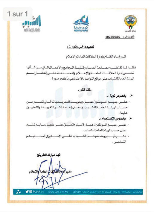 وكان التعميم المذكور والمذيل بتوقيع مدير العلاقات العامة والإعلام فهد الخرينج والموجه إلى رؤساء الأقسام بالإدارة نص على أنه «نظراً لما تقتضيه مصلحة العمل وتنفيذ البرامج والأعمال التي تخص إدارة العلاقات العامة والإعلام، وللمساعدة على انتشار اسم الهيئة العامة للشباب على مواقع التواصل الاجتماعي بأكبر صورة، فقد تقرر بخصوص تويتر أن على جميع الموظفين عمل ريتويت للتغريدات، التي تصدر من حساب الهيئة، وعمل إعادة نشر التغريدة والتعليق عليها».أما بخصوص الإنستغرام، ووفق الكتاب فإنه، «على جميع الموظفين عمل لايك وتعليق على كل ما يتم نشره على حساب الهيئة، ونشر فيديوهاتها على الإستوري لحسابكم الشخصي».أي أن بصمة موظفي الهيئة أضحت بموجب الكتاب الفريد من نوعه محصورة في «تويتر» و«إنستغرام»، بدلاً من أن تكون في تنفيذ استراتيجية متفق عليها للنهوض بهيئة تعاني كثيراً من التأخر.وفات الهيئة أن انتشارها يكون بما تقدمه من برامج وتطوير للشباب، وشغل أوقاتهم فيما يفيدهم، وتنفيذ الأهداف التي أنشئت من أجلها، وعندئذ سيصفق لها الجميع، أما محاولتها جعلها بطلة من ورق بـ «الريتويت» عبر العالم الافتراضي، فهذا ليس في اللوائح ولا الأنظمة المعمول بها في الجهاز الحكومي.ويبقى السؤال في ضوء إعلان الوزير تشكيل لجنة التحقيق: هل تتراجع الهيئة عن تعميمها «الفضيحة» ومحاسبة المتسببين فيه وتصدر بياناً بذلك؟ أم ستستمر في جعلها أضحوكة المغردين والمغردات بالسوشيال ميديا؟