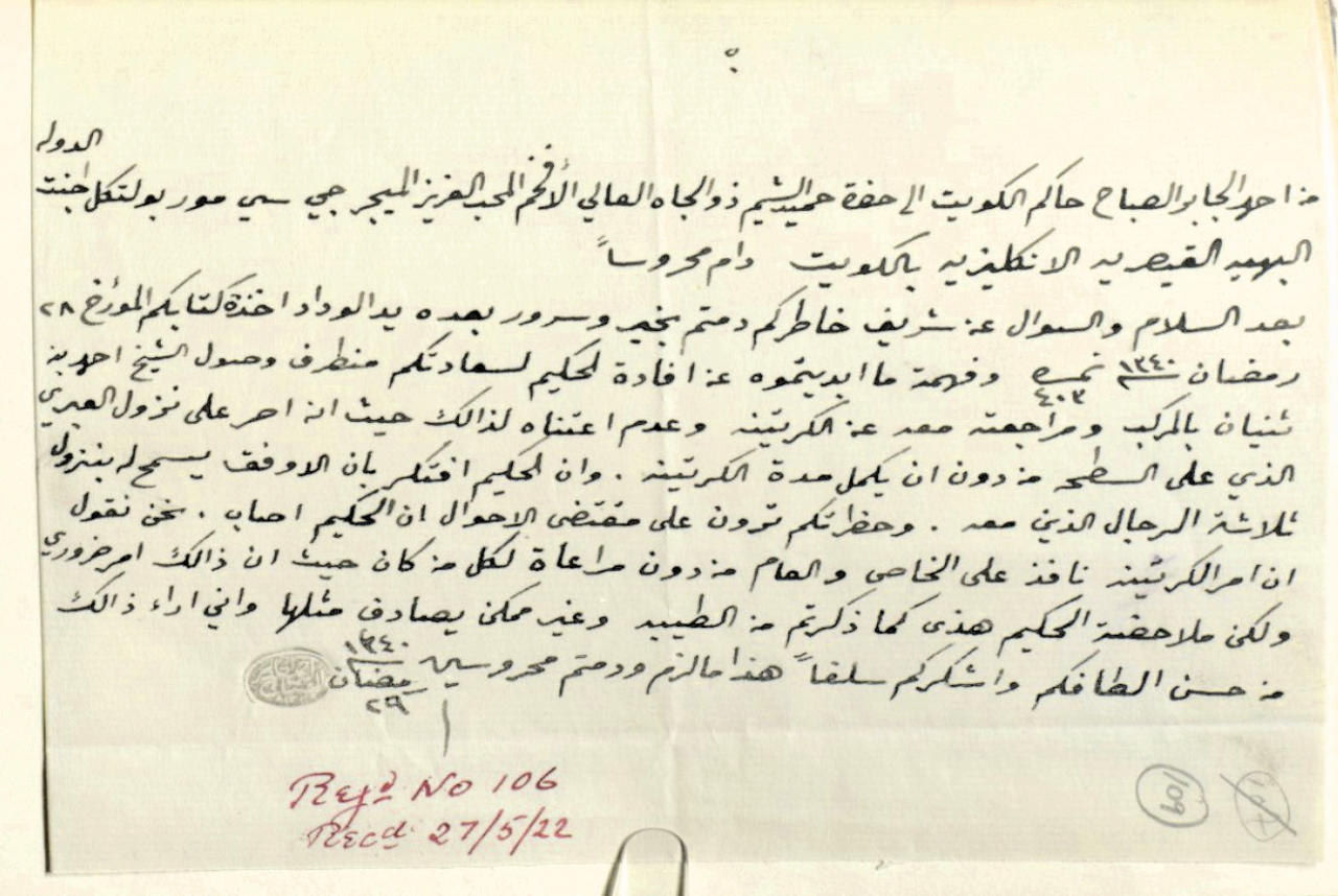 بعد هذا العرض الموجز لسيرة الأمير أحمد الثنيان، نعود إلى استعراض رسالة الشيخ أحمد الجابر الصباح الجوابية على رسالة الوكيل السياسي البريطاني في الكويت، بخصوص زيارة الأمير أحمد الثنيان للكويت التي عرضنا ظروفها في مقالنا السابق، فقد ذكرنا أن الثنيان أصر على دخول مرافقيه معه دون الالتزام بنظام «الكرنتينة»، وأن طبيب المعتمدية البريطانية سمح لهم بذلك تجنباً لوقوع سوء فهم أو مشكلة بين أمير الكويت الشيخ أحمد وضيفه الأمير الثنيان. وقد أعرب الشيخ أحمد عن موافقته على قرار الطبيب وقرار الوكيل السياسي البريطاني، ولم يعترض على ذلك، وإليكم نص الرسالة: «من أحمد الجابر الصباح حاكم الكويت إلى حضرة حميد الشيم ذو الجاه العالي الافخم المحب العزيز الميجر جي سي مور بولتكل اجنت الدولة البهية القيصرية الإنكليزية بالكويت دام محروسا..بعد السلام والسؤال عن شريف خاطركم دمتم بخير وسرور بعده،، يد الوداد اخذة (اخذت) كتابكم المؤرخ 28 رمضان سنة 1340 نمرة 403 وفهمة (فهمت) ما ابديتموه عن افادة الحكيم لسعادتكم منطرف (من طرف) وصول الشيخ احمد بن ثنيان بالمركب ومراجعته معه عن الكرنتينة وعدم اعتناه لذلك حيث انه اصر على نزول العبري الذي على السطحة من دون ان يكمل مدة الكرنتينة. وان الحكيم افتكر بان الاوفق يسمح له بنزول ثلاثة الرجال الذين معه. وحضرتكم ترون على مقتضى الأحوال ان الحكيم أصاب. نحن نقول ان امر الكرنتينة نافذ على الخاص والعام من دون مراعاة لكل من كان حيث ان ذلك امر ضروري ولكن ملاحظة الحكيم هذي كما ذكرتم من الطيبة وغير ممكن يصادف مثلها واني اراء (أرى) ذلك من حسن الطافكم واشكركم سلفا هذا ما لزم ودمتم محروسين 29 رمضان سنة 1340».