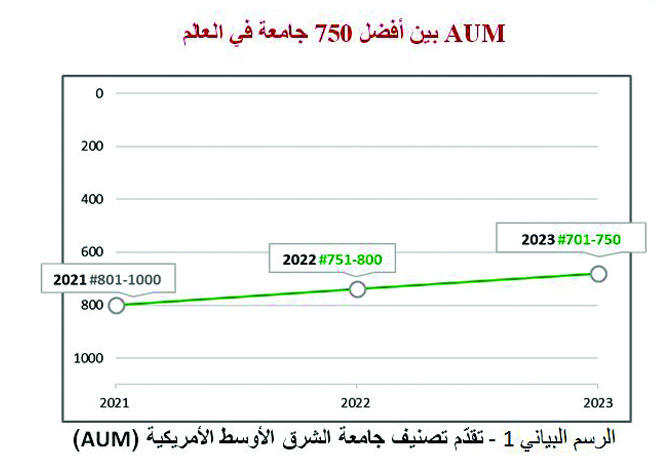 AUM تقدّمت بشكل لافت في تصنيف QS من مرتبة 801-1000 عام 2021 إلى مرتبة 751-800 عام 2022 وصولاً إلى مرتبة 701-750 في ترتيب سنة 2023