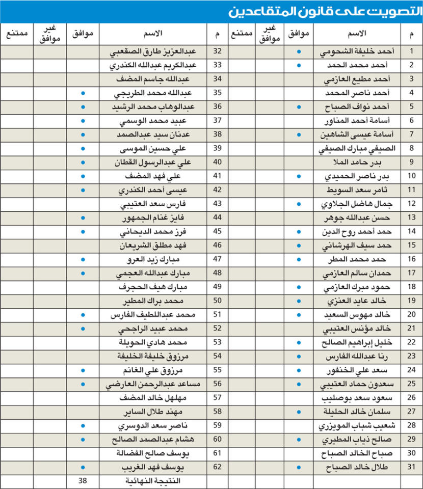 من ناحيته، قال النائب عبيد الوسمي: هناك لبس متعمد أثير في الآونة الأخيرة حول القانون، «الذي تشرفت أن أكون فيه رئيس اللجنة التشريعية في اللجنة المشتركة واجتمعنا مرتين وحصلت الموافقة من خلال 13 نائبا ورفض نائب واحد فقط، وحديثنا ليس دفاعا عن الحكومة انما عن المال العام بعد ان صدر اتهام صريح بأن الـ 500 مليون سرقة للمال العام، وهذا غير صحيح، وإنما ذلك يأتي بالتزام الدولة بتغطية العجوزات والـ500 مليون ليست اجمالي العجز، انما جزء بسيط لسداد العجز والمنحة استحقاق سياسي وطني من ولي العهد وهي لا تقبل التأخير ولم تكن هذه المسألة محلا للمساومات».وقال الوسمي: أين السرقة والتجاوز في الـ 500 مليون دينار لسداد العجز؟ ومن يرى ذلك فليثبت صراحة، والاستعراض التاريخي المتعلق بالبناء المالي الخاص بالتأمينات يؤكد وجود عشرات التشريعات الكفيلة بسد العجز الاكتواري من خلال الخزانة والعجز 24 مليون دينار، وبغض النظر عن كلام النائب عبدالصمد اقول له ان الدولة تلتزم بسداد الـ 500 مليون سواء كان العجز 2 مليار او 24 مليارا، ونفس المجموعة التي كانت تعوق العفو الأميري هي نفسها اليوم تعارض قانون المتقاعدين، والموافقة جاءت بشبه اجماع والـ 500 مليون دينار كانت موجودة في جلسة 17 مارس ولم يعارض احد.وأضاف: «اللجنة المالية فتحت الباب لاقتراحات النواب ولم يتقدم احد ومن يريد الاعتصام نقول له اعتصم لكن تتهمنا بالتجاوز لن نسمح لك ولا لغيرك، ومن يقول تجاوز نقول له انت ما تفهم اطلع الى الشعب الكويتي، وقل أسبابك، ومن يقل ان المنحة تصرف بلا قانون فهذا غير صحيح وأنتم تخلطون القانون بالجغرافيا والسياسية والمسألة لا تحتمل اكثر من انه اما نحن خطأ او انتم، لكن لن نسمح لك ولا لأكبر منك باتهامنا، وهذه المنحة ستمر لمستحقيها قبِل من قبل ورفض من رفض».وقال الغانم: هناك تعديل بأن يكون تقييم المقابل العيني تحت رقابة ديوان المحاسبة وسيصوت عليه المجلس وآخر بإلغاء المادة الرابعة، وهذا رفض من الحكومة والمجلس، ووافق المجلس على تعديل بأن يكون تقييم المقابل العيني من خلال مقيمين وتحت رقابة المحاسبة.وصوت المجلس في المداولتين بالموافقة على قانون المتقاعدين ومنحة الـ 3 آلاف دينار من خلال موافقة 38 عضوا من اصل 38 عضوا حاضرا.وأعرب الغانم عن شكره الحكومة والمجلس وكل من ساهم في إنجاز هذا القانون «وأبارك للمتقاعدين والقانون احتاج إلى اغلبية خاصة وتمت الموافقة عليه».من جانبه، قال وزير المالية عبدالوهاب الرشيد: عاهدنا المتقاعدين على تحقيق مطالبهم وعاهدنا أنفسنا لاستدامة أموال المؤسسة العامة للتأمينات وتشكيل فريق لدراسة مطالبات المتقاعدين وشكر لسمو الأمير وولي العهد الذي وجهنا لتحقيق مطالب المتقاعدين. ثم رفع الغانم الجلسة.الراجحي: حضرنا حتى لا ينال المتقاعدون حقوقهم بالاعتصامات
