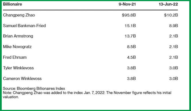 ورغم قلة الأدلة على حدوث تصدعات في سوق العمل الأميركي الأوسع حتى الآن، فقد أدت الخسائر في الأصول الرقمية إلى لجوء بعض أصحاب المليارات المشفرة إلى خفض الوظائف، وقال زاو، مؤسس «بينانس» (Binance)، التي تعد أكبر بورصة للعملات الرقمية في العالم، إن شركته لديها «صندوق حرب صحي جدا» وتقوم بتوسيع التوظيف.ومع ذلك، تراجعت الثروة الشخصية للرجل البالغ 44 عاما، والتي كانت تحتل المرتبة 11 في العالم، وذلك بمعدل 89 في المئة لتصل إلى 10.2 مليارات دولار منذ انضمامه لأول مرة ضمن مؤشر «بلومبرغ» للثروة في يناير، وأصبحت شركته أيضا نقطة محورية للمحققين الأميركيين الذين يسعون إلى كبح جماح صناعة التشفير.وانخفضت ثروة بانكمان- فرايد، الرئيس التنفيذي لمنصة تداول العملات المشفرة «إف تي إكس» (FTX)، والذي يبلغ 30 عاما، بنسبة 66 في المئة منذ أن بلغت ذروتها عند 26 مليار دولار، ويمكن أن يضعف ذلك خططه للتبرع بأمواله والتركيز بشكل كبير على السياسة، لقد ضخ 16 مليون دولار في لجان العمل السياسي الفائقة في أبريل، مما جعله أحد أكبر المتبرعين لمجموعات خارجية، وقال إنه يتوقع تقديم أكثر من 100 مليون دولار خلال الانتخابات الرئاسية المقبلة لدعم الديموقراطيين.نوفوغراتز، البالغ 57 عاما، والذي تمت تصفية صندوقه الكلي في «فورتريس إنفستمنت غروب» (Fortress Investment Group) في عام 2015 بعد عامين من الخسائر، راهن على عودته إلى العملة المشفرة، واصفا عملة «تيرا» مؤخرا بأنها «فكرة كبيرة فشلت»، وتراجعت ثروته الاثنين إلى 2.1 مليار دولار، أي أقل مما كانت عليه عندما ظهر لأول مرة ضمن مؤشر «بلومبرغ» للمليارديرات في ديسمبر 2020، عندما تم تداول «بتكوين» بنحو 29 ألفا.في غضون ذلك، تراجعت ثروتا كاميرون وتايلر وينكلفوس إلى 3 مليارات دولار لكل منهما، من 5.9 مليارات لكل منهما. يقوم التوأم البالغان 40 عاما، والمؤسسان لشركة «جيميني» (Gemini) للعملات المشفرة، والتي أعلنت هذا الشهر أنها ستخفض نحو 10 في المئة من قوتها العاملة، بجولة حاليا مع فرقة موسيقى الروك «مارس جنكشن» (Mars Junction) الخاصة بهما.