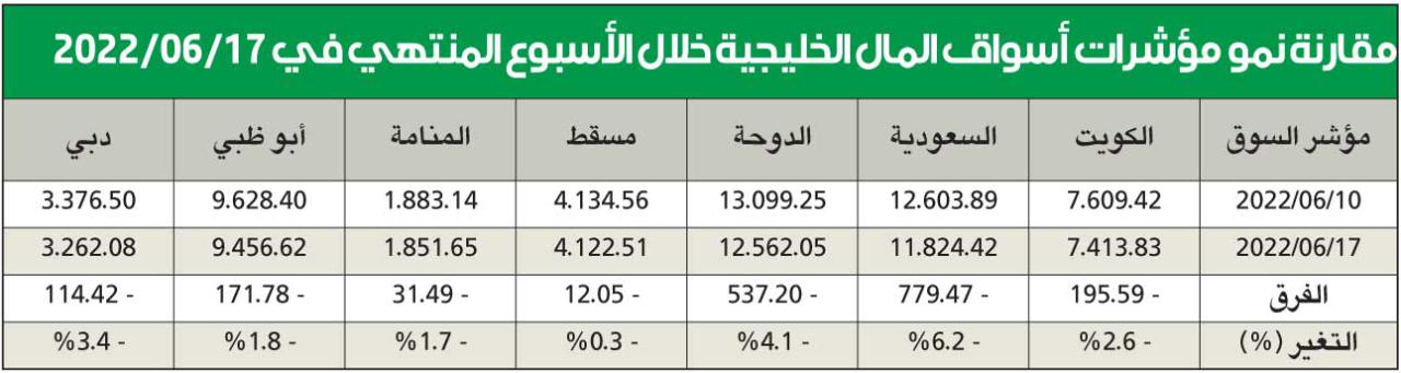 ووفقاً للمعطيات المقلقة، تراجعت الأسواق المالية العالمية بينما صمدت مؤقتاً أسعار النفط، لكنها استجابت بنهاية المطاف، وبعد إقفال الأسواق المالية الخليجية وانهارت بخسائر بلغت 7 في المئة تقريباً وأقفل برنت على مستوى 113 دولاراً للبرميل.وتراجع مؤشر السوق السعودي الرئيسي «تاسي» بنسبة كبيرة هي ثاني أكبر خسارة أسبوعية خلال هذا العام وبعد خسارته في بداية مايو نسبة 7 في المئة بعد تداول خبر زيادة سريعة في رفع الفائدة لتلتهم هذه الخسائر مكاسب العام الكبيرة، التي بلغت في أفضل أيامها نسبة 21 في المئة، ولم يتبق منها سوى 4.1 في المئة ويقفل مؤشر السوق السعودي الرئيسي عند أدنى مستوياته في خمسة أشهر عند مستوى 11824.42 نقطة متراجعاً بنسبة 6.2 في المئة أي 779.47 نقطة ومتخلياً بشكل واضح عن مستوى 12 ألف نقطة الذي حاول التشبث به أكثر من أسبوع.