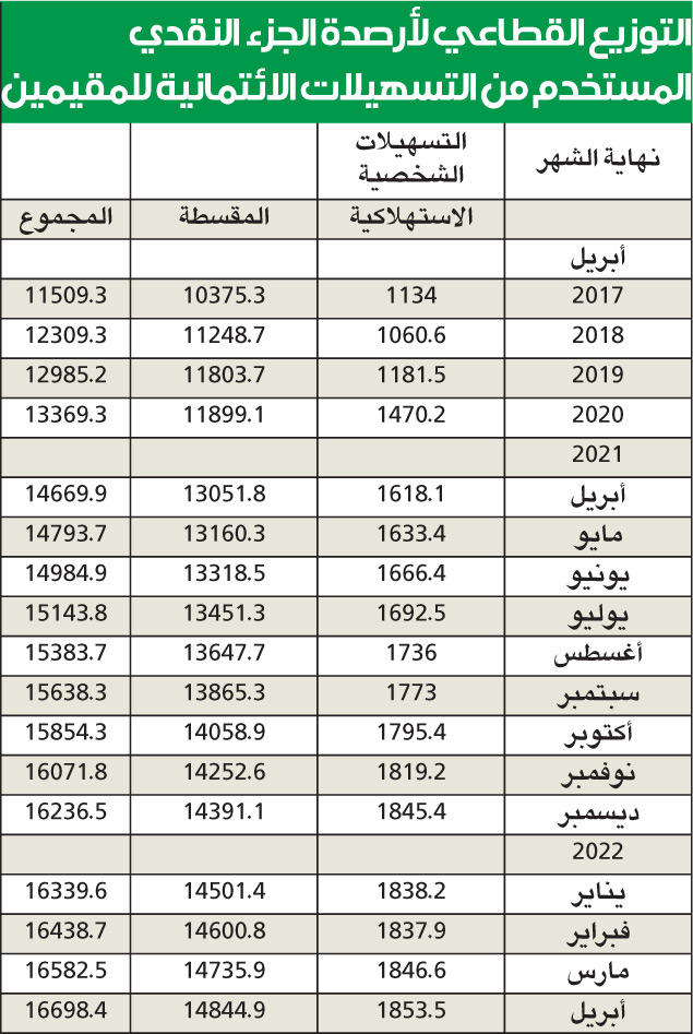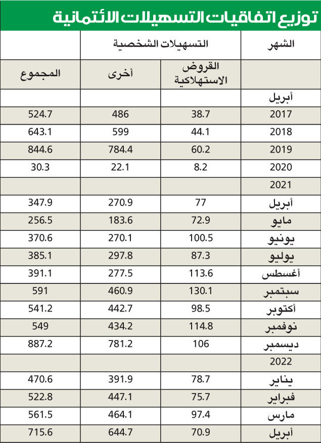 بلغت التسهيلات الشخصية في التوزيع القطاعي لأرصدة الجزء النقدي المستخدم من التسهيلات الائتمانية لشهر أبريل 2022 مبلغ 16698.4 مليون دينار مقارنة بأبريل التي بلغت 14669.9 مليون دينار، أي زيادة بقدر 2028.5 مليون دينار وبنسبة 12.1 في المئة، وبنظرة سريعة على الأرقام يتبين لنا أن الاستهلاك في ازدياد حتى مع الأزمة الصحية التي اجتاحت البلاد، ويتبين لنا أن القروض الشخصية الاستهلاكية لعام 2021 انخفضت كثيراً في شهري أغسطس وسبتمبر وبلغت على التوالي 1736 و1773 مليون دينار، وذلك كان بسبب الحظر والإغلاقات.نمت التسهيلات الشخصية بنسبة 31 في المئة خلال خمس سنوات، كانت في أبريل عام 2017 بقيمة 11509.3 مليون دينار وأصبحت في عام أبريل 2022 بقيمة 16698.4 أي زيادة بلغت قيمة 5189.1 مليون دينار.التسهيلات الشخصية تشمل التسهيلات الاستهلاكية والتسهيلات المقسطة (الإسكانية)، فالتسهيلات المقسطة زادت بنسبة 30.1 في المئة في خمس سنوات من أبريل 2017 حتى أبريل 2022، التسهيلات المقسطة هي القروض الشخصية الطويلة الأجل التي يستخدمها المقترض لأغراض غير تجارية وتحديداً تستخدم لترميم أو شراء سكن خاص، أن زيادة الطلب على هذا النوع من الاستخدام يثبت أن البلد يعاني الأزمة الإسكانية بشكل واضح لا سيما أن الأسعار في زيادة لا تراجع.كما ارتفعت نسبة التسهيلات الاستهلاكية بنسبة 38.8 في المئة، وهي تمثل نفقات التعليم والعلاج وشراء السلع المعمرة وغيرها من الاحتياجات الشخصية، فقد بلغ مجموع القروض الشخصية 1134 مليون دينار في أبريل عام 2017 مقارنة بـ1853.5 مليون دينار في أبريل لعام 2022، أي بزيادة 719.5 مليون دينار.