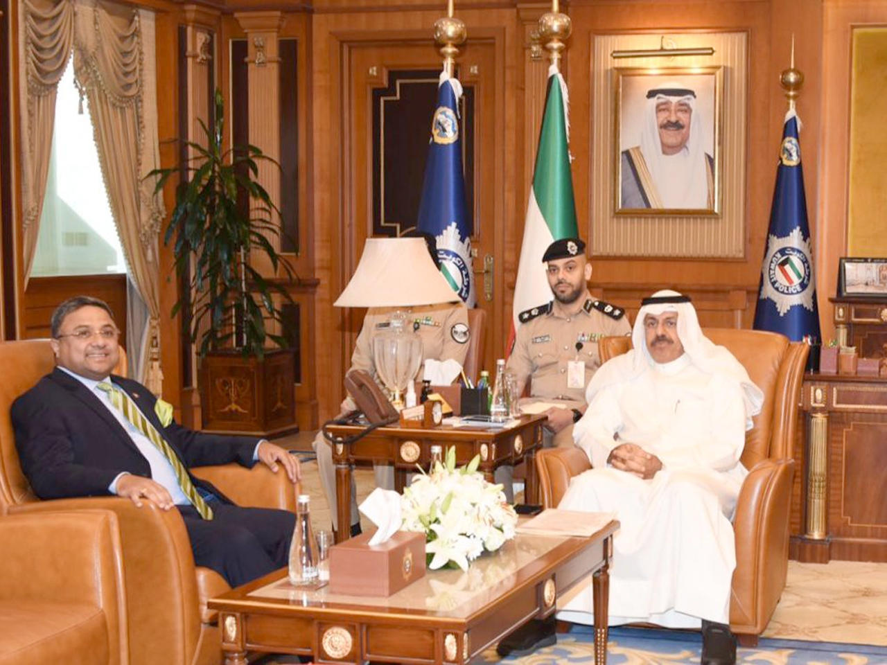 كما استقبل النواف سفير الهند سيبي جورج، ورحب بضيفه، مؤكداً عمق علاقات التعاون بين البلدين الصديقين، وتم خلال اللقاء بحث عدد من الموضوعات المشتركة، خصوصاً المتعلقة بالجالية الهندية في البلاد.وبدوره، أعرب سفير الهند عن شكره وتقديره للنائب الأول على حسن الاستقبال، وما تلقاه الجالية الهندية من رعاية واهتمام في الكويت.واستقبل النواف رئيس المجلس البلدي عبدالله المحري، وبارك له تزكيته برئاسة «البلدي»، متمنيا له وللمجلس كل التوفيق والنجاح. وتم خلال اللقاء بحث عدد من الموضوعات المشتركة، وأكد النواف أهمية دور «البلدي» وما يقوم به من مهام عديدة تصب في مصلحة الوطن والمواطنين.وأعرب المحري عن شكره لوزير الداخلية على حسن الاستقبال، معرباً عن تقديره الكبير للمؤسسة الأمنية بجميع قطاعاتها في إرساء دعائم الأمن والأمان في البلاد. من جانب آخر، كرّم النائب الأول رئيس قسم اختبار القيادة في محافظة الجهراء العقيد محمد الهاجري ومديحة العنزي من قطاع المرور والعمليات، لجهودهما المتميزة في أداء أعمالهما بكل امانة وإخلاص، وذلك بحضور وكيل وزارة الداخلية الفريق أنور البرجس، والوكيل المساعد لشؤون المرور والعمليات اللواء جمال الصايغ، ومساعد المدير العام للإدارة العامة للمرور لشؤون التعليم الشيخ فواز الخالد.وأشاد النواف بالمكرمين وحثهما على مواصلة هذا الجهد الذي يجسد حبهما لوطنهما الكويت، ويحافظ على الأداء الأمني الفاعل في محاربة الجريمة، والتصدي بكل حزم لأي عمل مخالف للقانون، متمنياً لهما التوفيق في عملهما.وأعرب المكرمان عن شكرهما وتقديرهما للنائب الأول على دعمه الدائم للمتميزين من منتسبي المؤسسة الأمنية، مؤكدين أن هذا التكريم سيكون حافزاً لهما لبذل المزيد من الجهد والعطاء في خدمة الكويت وأمنها.