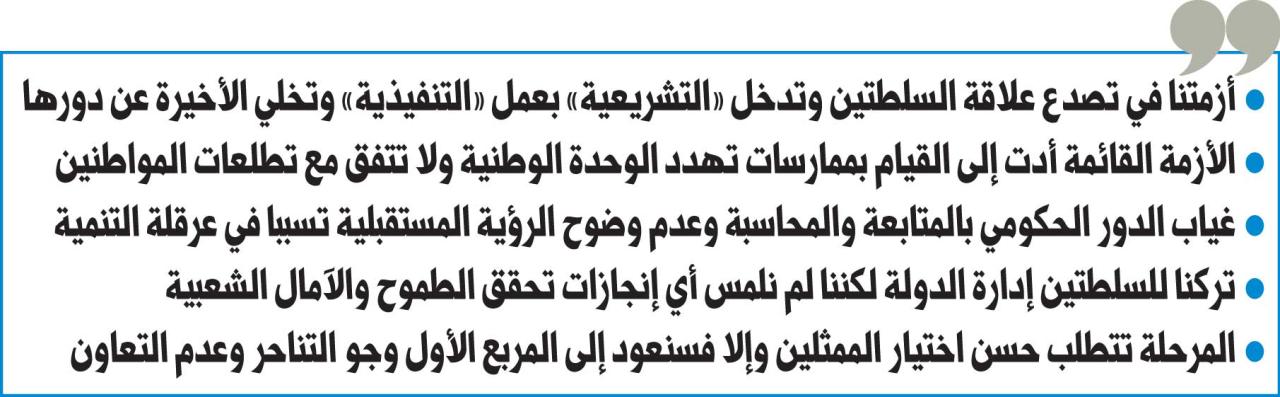 • لم نلمس من الحكومة والبرلمان أي إنجازات وانتهيا إلى تذمر المواطنين وسخطهم على عملهما