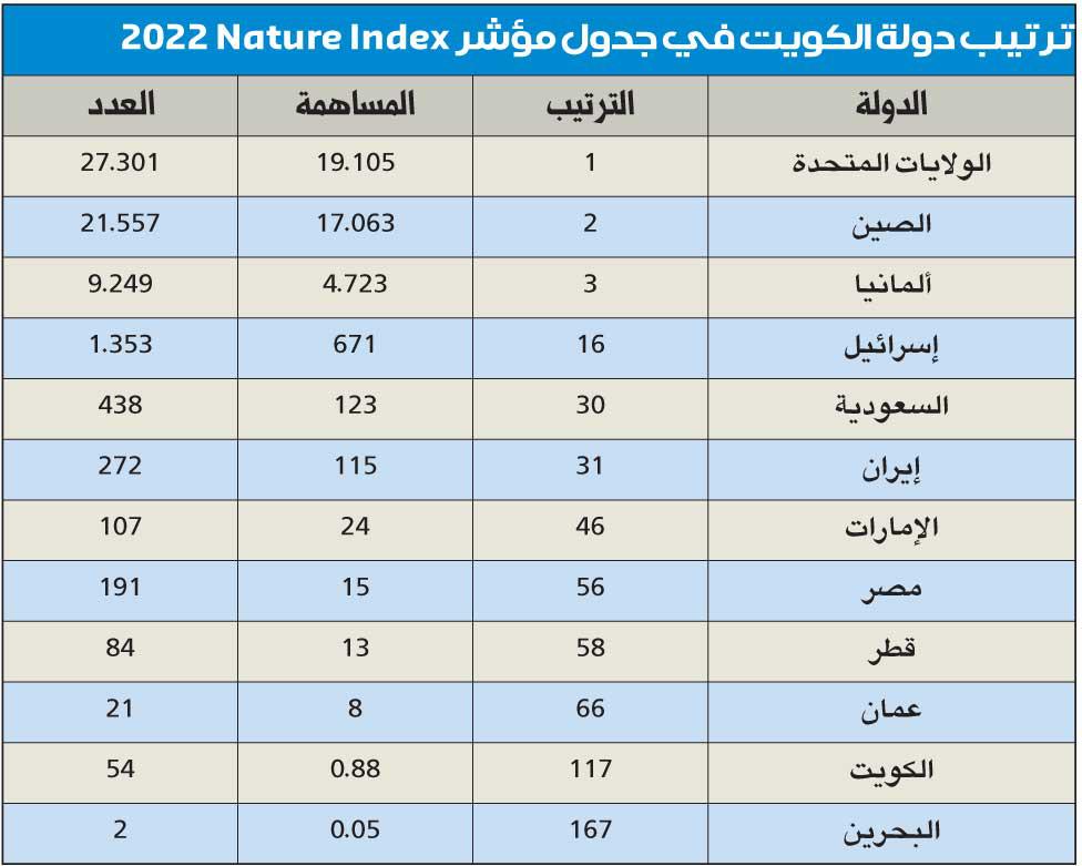 حلت دولة الكويت في المرتبة 117 من أصل 179 دولة في ترتيب الدول في مؤشر «Nature Index 2022» للأبحاث في 82 مجلة علمية عالية الجودة في مجال العلوم الطبيعية، خلال الفترة من الأول من مارس 2021 حتى 28 فبراير 2022.وأكدت مصادر مطلعة لـ«الجريدة»، أن ترتيب الكويت في هذا المؤشر يعتبر متدنياً، لافتة إلى أن عدد مقالات البحوث المشاركة اقتصر على 54 وبمساهمة بلغت 0.88 في مختلف علوم الفيزياء والحياة والطبيعة والأرض والكيمياء وغيرها».وأضافت المصادر أن أبرز الجهات المشاركة في البحوث المنشورة في المجلات العلمية المرموقة جامعة الخليج للعلوم والتكنولوجيا، وجامعة الكويت، والجامعة الأميركية للشرق الأوسط، والهيئة العامة للزراعة والثروة السمكية، وشركة نفط الكويت، مركز دسمان لعلاج وأبحاث السكري».