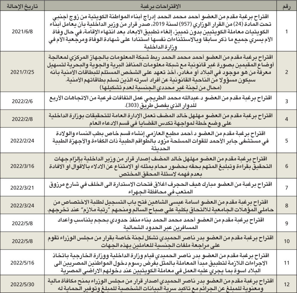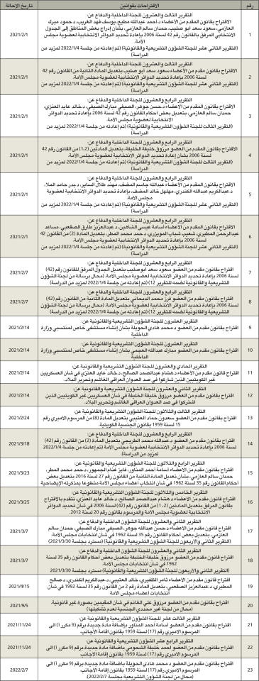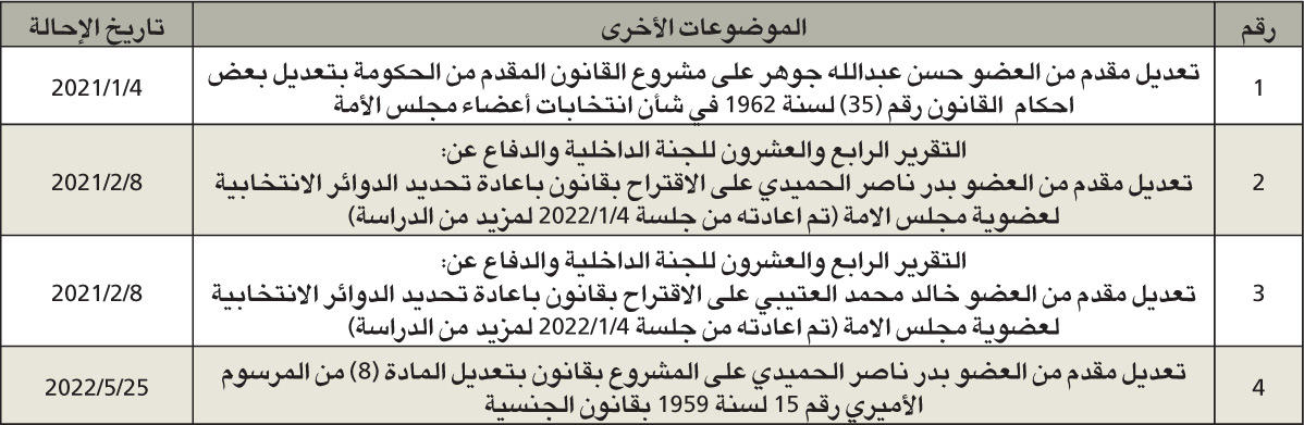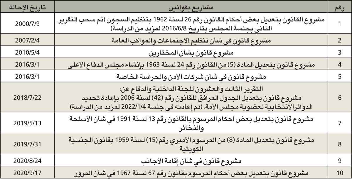 بلغ عدد الموضوعات المدرجة على جدول أعمال لجنة شؤون الداخلية والدفاع، والتي لم يتم إنجازها حتى مايو الماضي، 49 موضوعا، بينها 10 مشاريع بقوانين، و23 اقتراحا بقانون، و12 اقتراحا برغبة، و4 موضوعات أخرى.ومن أبرز الموضوعات المهملة في «الداخلية والدفاع» مشروع حكومي واقتراحات بقوانين بشأن تعديل قانون الانتخابات، حيث لم تنجز اللجنة تقريرها بعد أن أعاده المجلس إليها في 4 يناير 2022 بناء على طلبها، ويضاف إلى ذلك أن هناك موضوعات منذ أكثر من 20 سنة موجودة باللجنة، ولم يتم اتخاذ قرار بشأنها، مثل مشروع تعديل بعض أحكام قانون تنظيم السجون المحال إليها في 9 يوليو 2000، وأخرى منذ 15 عاما، حيث تمت إحالة مشروع قانون بشأن تنظيم المواكب العامة في 4 فبراير 2007، وكذلك ما يتعلق بتعديل قانون الجنسية الكويتية والحراسة الخاصة وإقامة الأجانب وتعديل أحكام قانون المرور.وبلغت نسبة إنجاز اللجنة خلال مايو صفرا، حيث لم تنجز أي تقرير خلال 30 يوما عقدت خلالها اجتماعا واحدا استغرق ساعة واحدة، ورغم أنه لم يتبق إلا أيام معدودات على عمر دور الانعقاد الثاني فإن أغلب إنجاز اللجنة خلاله كان عبارة عن اقتراح برغبة، إذ تمكنت في 21 مارس الماضي، الذي صادف «عيد الأم»، من إنجاز 62 اقتراحا برغبة دفعة واحدة، وإذا لم تسارع اللجنة لتعويض ما فاتها فستسلم نظيرتها في الدور المقبل تركة ثقيلة من الموضوعات التي غطاها التراب.