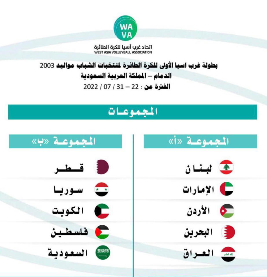 أوقعت قرعة بطولة اتحاد غرب آسيا الأولى للكرة الطائرة لمنتخبات الشباب مواليد 2003، التي جرت أمس، عبر الاتصال المرئي، والمقررة إقامتها في مدينة الدمام السعودية خلال الفترة من 22 يوليو الجاري حتى 31 منه،