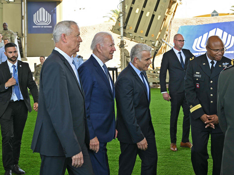 بايدن متفقداً أنظمة دفاع جوي إسرائيلية في مطار بن غوريون أمس (أ ف ب)