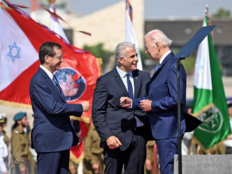 وقال بايدن، في كلمته بالمطار: «يشرّفني أن أقف بين الأصدقاء لأزور دولة إسرائيل اليهودية المستقلة»، مضيفاً: «علاقتنا أقوى وأعمق مما كانت عليه في السابق، وسنعمل معها على تعزيز منظومة إسرائيل الدفاعية، بما في ذلك القبّة الحديدية، وسنستمر بعملنا المشترك لمكافحة سموم معاداة السامية».وأضاف بايدن: «سنناقش حل الدولتين ودعمنا المستمر من أجل إحلال السلام في المنطقة، مشيراً إلى أنه يريد السلام، ولا يريد لأخطاء الماضي أن تتكرر، لأن السلام مهم جداً لشعوب المنطقة. وتعهد بايدن بإعطاء دفع لعملية «اندماج» إسرائيل في المنطقة.وقبله، أعلن الرئيس الإسرائيلي أنه ستتم مناقشة المخاطر الأمنية التي تفرضها إيران وأذرعها في المنطقة، مؤكداً أنّ «زيارة بايدن رحلة سلام تنطلق من إسرائيل إلى السعودية». وخاطب هيرتسوغ بايدن: «الشعب الإسرائيلي يرحب بك بأيادٍ مفتوحة، وزيارتك تمثّل عمق علاقاتنا».بدوره، قال لابيد، الذي تولى مهامه قبل أقل من أسبوعين: «سنناقش مع بايدن مسائل الأمن القومي، وضرورة تجديد تحالف عالمي قوي يوقف برنامج إيران النووي، وسنبحث بناء هيكلية أمنية واقتصادية جديدة في الشرق الأوسط».وعلى متن الطائرة الرئاسية، شدّد مستشار الأمن القومي جاك سوليفان على أن بايدن سيكون «صريحاً» مع إسرائيل بشأن الجهود الأميركية الرامية لإبرام الاتفاق النووي مع إيران.