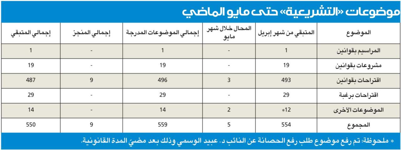 وفي تقرير للأمانة العامة للمجلس، فإنّ اللجنة ودّعت مايو الماضي وعلى جدول أعمالها 550 موضوعاً لم تنتهِ منها، ولم تتمكن خلاله من إنجاز سوى 9 موضوعات، أي أن نسبة إنجازها خلاله 1.6 بالمئة.