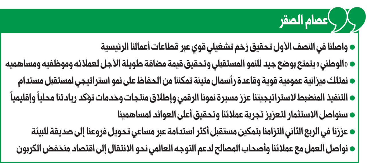 وأكد الصقر أن «الوطني» استمر في تحقيق نمو قوي في المجالات الاستراتيجية التي شملت إدارة الثروات والخدمات المصرفية الإسلامية. وأوضح أن البنك واصل تقديم أداء مالي جيد مدفوعا بنمو الإيرادات التشغيلية إلى 480.2 مليون دينار، وبنسبة 6.1 في المئة، هذا إلى جانب مواصلة التحسن مستويات تكلفة المخاطر، والتي دعمت نمو الربحية في النصف الأول من العام.وقال الصقر: «بفضل التنفيذ المنضبط لاستراتيجيتنا، نخطو بثبات نحو تنفيذ جدول أعمالنا الرقمي وإطلاق المزيد من المنتجات والخدمات التي تعزز ريادتنا محلياً وإقليميا»، مشيرا إلى أن البنك سيواصل الاستثمار لتعزيز تجربة عملائه، وجذب أفضل المواهب والاحتفاظ بها، هذا إلى جانب تحقيق أعلى العوائد للمساهمين وخلق تغيير إيجابي للمجتمعات التي يعمل بها.