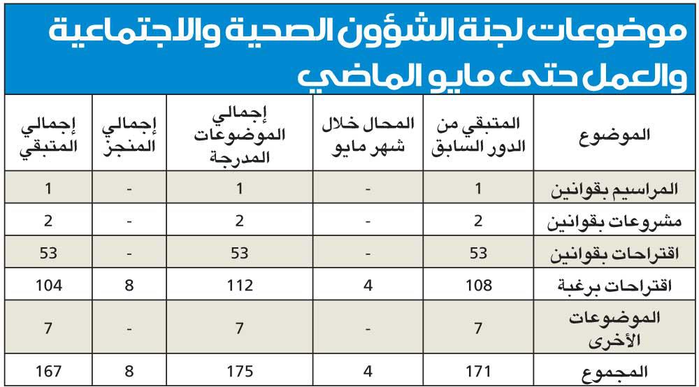 بلغ إجمالي الموضوعات التي أنجزتها لجنة الشؤون الصحية والاجتماعية والعمل البرلمانية خلال شهر مايو الماضي 8 موضوعات، جميعها كانت اقتراحات برغبة من أصل 175 موضوعاً مدرجاً على جدول أعمالها مرحّلة من أشهر سابقة، وبلغت نسبة إنجازها في هذا الشهر 4.5 بالمئة.وتنوعت المواضيع المتبقية على جدول أعمالها بين مرسوم بقانون ومشروعين بقانونين و53 اقتراحاً بقانون، و112 برغبة، و7 موضوعات أخرى.وبالنسبة إلى الاقتراحات الـ 8 التي أنجزتها «الصحية» في اجتماعها المنعقد 30 مايو الماضي هي اقتراح برغبة مقدّم من العضو د. حمد المطر، باستثناء الصيادلة من أعضاء الهيئة الأكاديمية بجامعة الكويت الحاصلين على درجة أستاذ مشارك للحصول على ترخيص صيدليته الخاصة في القطاع الأهلي؛ أسوة بزملائهم في مختلف الكليات الأخرى.