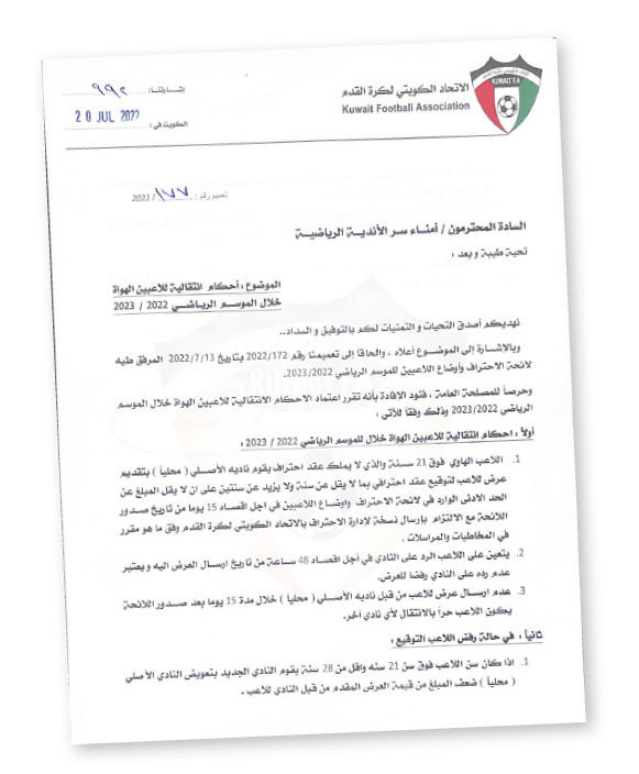 وألزمت اللائحة الجديدة لانتقالات اللاعبين، اللاعب الرد على النادي في أجل أقصاه 48 سـاعة من تاريخ إرسال العرض إليه من ناديه، ويعتبر عدم رد اللاعب على النادي رفضاً للعرض، وهو ما يعني حال كان اللاعب فوق 21 سنة وأقل من 28 سنة، أن يقوم ناديه الجديد بتعويض ناديه الأصلي بضعف المبلغ المقدم إليه من أجل البقاء.وفي حال كان اللاعب فوق 28 عاماً، يقوم النادي الجديد بتعويض النادي الأصلي «محلياً» بنصف قيمة العرض المقدم من النادي للاعب.وأوضح الاتحاد أنه لن يقبل تسجيل اللاعب مع النادي الجديد إلا بعد سداد المبلغ المقرر لناديه الأصلي «محلياً» دون الإخلال بالمادتين رقمي 27 و28 وغيرهما من المواد ذات الصلة بلائحة الاحتراف، على أن تطبق هذه الاحكام الانتقالية لمعالجة أوضاع اللاعبين الهواة فوق 21 سنة مرة واحدة مع أنديتهم الأصلية المحلية، على أن ينتهي العمل بها نهاية الموسم الرياضي 2023/2022.
