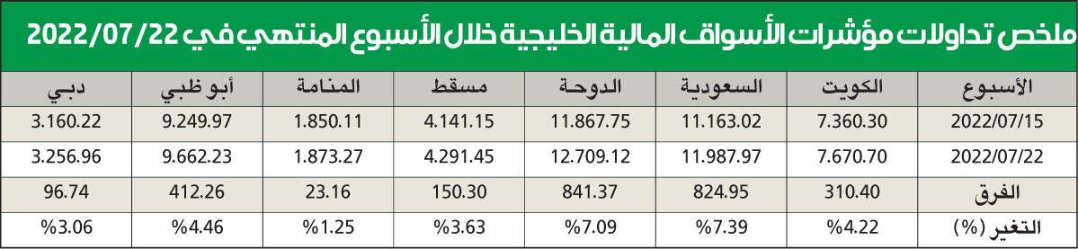ارتدت مؤشرات الأسواق الأميركية كذلك أسعار بعض السلع وفي مقدمتها وهو الأهم النفط بنهاية تعاملات الأسبوع قبل الماضي وحقق داو جونز 2 في المئة مكاسب بالرغم من بيانات نسب التضخم الكبيرة التي تجاوزت 9.1 في المئة في الاقتصاد الأميركي لشهر يونيو الماضي.كذلك استعاد النفط مستوى 100 دولار لبرميل برنت مما دعم أداء مؤشرات الأسواق الخليجية بقوة مع بداية تعاملات الأسبوع ونهايته ليجمع مؤشر «تاسي» وهو الرئيسي لأكبر أسواق الشرق الأوسط السوق السعودي نسبة 7.4 في المئة وهي أكبر قفزة أسبوعية له منذ أبريل عام 2020 التي أعقبت تراجعات بداية كورونا، واستطاع أن يجمع 824.95 نقطة ليقفل قريباً من مستوى 12 ألف نقطة وتحديداً على مستوى 11987.97 نقطة.وكانت إعلانات الربع الثاني تدعم الأداء خصوصاً أن بعض الأسهم القيادية حقق قفزة كبيرة بالأرباح أبرزها سهم زين السعودية، كذلك نمت أرباح سهم المراعي بنسبة جيدة بلغت 7.5 في المئة.وكان النمو الإجمالي للشركات الـ 12 المعلنة نسبة 8 في المئة ويبقى السوق بانتظار إعلانات البنوك وشركات البتروكيماويات والتي سجلت قفزة بسبب ارتفاعات كبيرة في أسعار النفط والمشتقات البترولية مما سيدفع بأسعار الأسهم بقوة، وعاد مؤشر سوق الأسهم السعودي للنمو مرة أخرى وبلغت مكاسبه لعامنا هذا 2022 نسبة 5.2 في المئة.وقفزت أسعار الغاز الطبيعي بقوة خلال تعاملات الأسبوع الماضي وبنسبة 16 في المئة لتبلغ مكاسبه لهذا العام نسبة 119 في المئة، وليدعم مؤشر السوق القطري ليرتفع بنسبة 7 في المئة هي 841.37 نقطة ليقفل على مستوى 12709.12 نقطة إذ تسيطر دولة قطر على حصة 27 في المئة من التصدير العالمي للغاز المسال في صدارة دول العالم. وأعلنت 7 شركات عن أرباح الربح الثاني وكان في مقدمتها مصرف قطر الوطني الذي سجل نموا كبيرا بنسبة 12 في المئة، كما دار حديث كبير حول بيع شركة أوريدو لحصتها في شركة اتصالات مينمار والتي عانت منها خلال العامين الماضي كما أعلنت بعض الشركات عن مشاريع كبيرة، وينتظر الاقتصاد القطري افتتاح كأس العالم بعد 3 أشهر فقط.بقية المؤشرات