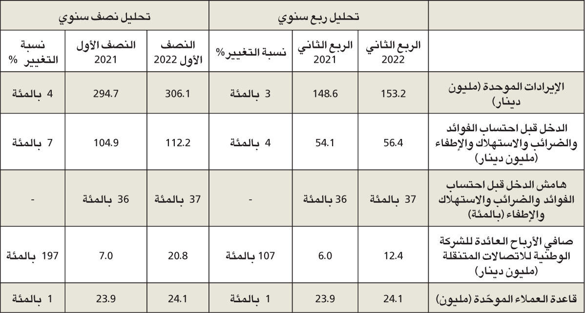 وبلغ صافي الربح العائد للشركة الوطنية للاتصالات المتنقلة 20.8 مليون دينار للنصف الأول من عام 2022، مقارنة بـ 7.0 ملايين لنفس الفترة من عام 2021، حيث استمد دعماً قويا من تحسّن الإيرادات التشغيلية والمالية من Ooredoo الكويت وOoredoo تونس وOoredoo الجزائر وOoredoo فلسطين وOoredoo المالديف. وبلغت الأرباح الموحدة للسهم الواحد 42 فلساً للنصف الأول من عام 2022 مقارنة بـ 14 فلساً للسهم الواحد لنفس الفترة من عام 2021. أما قاعدة العملاء الموحدة فبلغت 24.1 مليون عميل في نهاية النصف الأول من عام 2022 مقارنة بـ 23.9 مليونا في نهاية النصف الأول من عام 2021.
